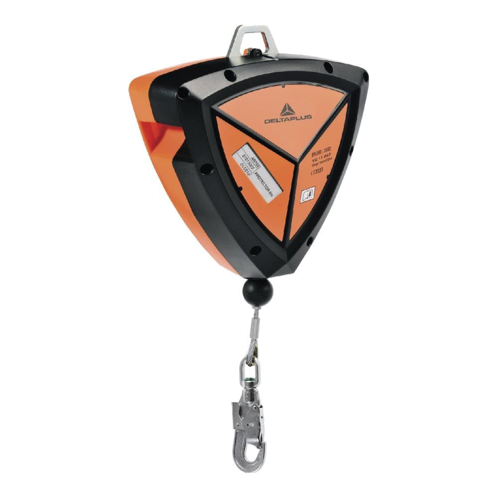 Устройство защиты от падения с самовтягивающимся тросом с энергопоглотителем. Инерционная тормозная система. Корпус из ABS. Трос из оцинкованной стали: диаметр- 4 мм, длина – 15 м. Карабин-крюк с вертлюгом из стали с индикатором падения. Испытано на 150 кг. Допускается горизонтальное применение.