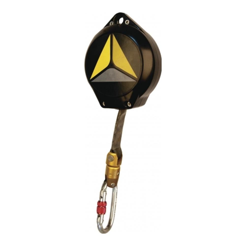 Поворотное автоматическое самовтягивающееся страховочное устройство. Инерционная тормозная система. Корпус из ABS пластика. Полиамидная лента: ширина- 25 мм, длина – 6 м. Вертлюг из алюминия с индикатором падения. В комплектацию входит 1 стальной карабин резьбовой АМ002. Испытано на 150 кг.
