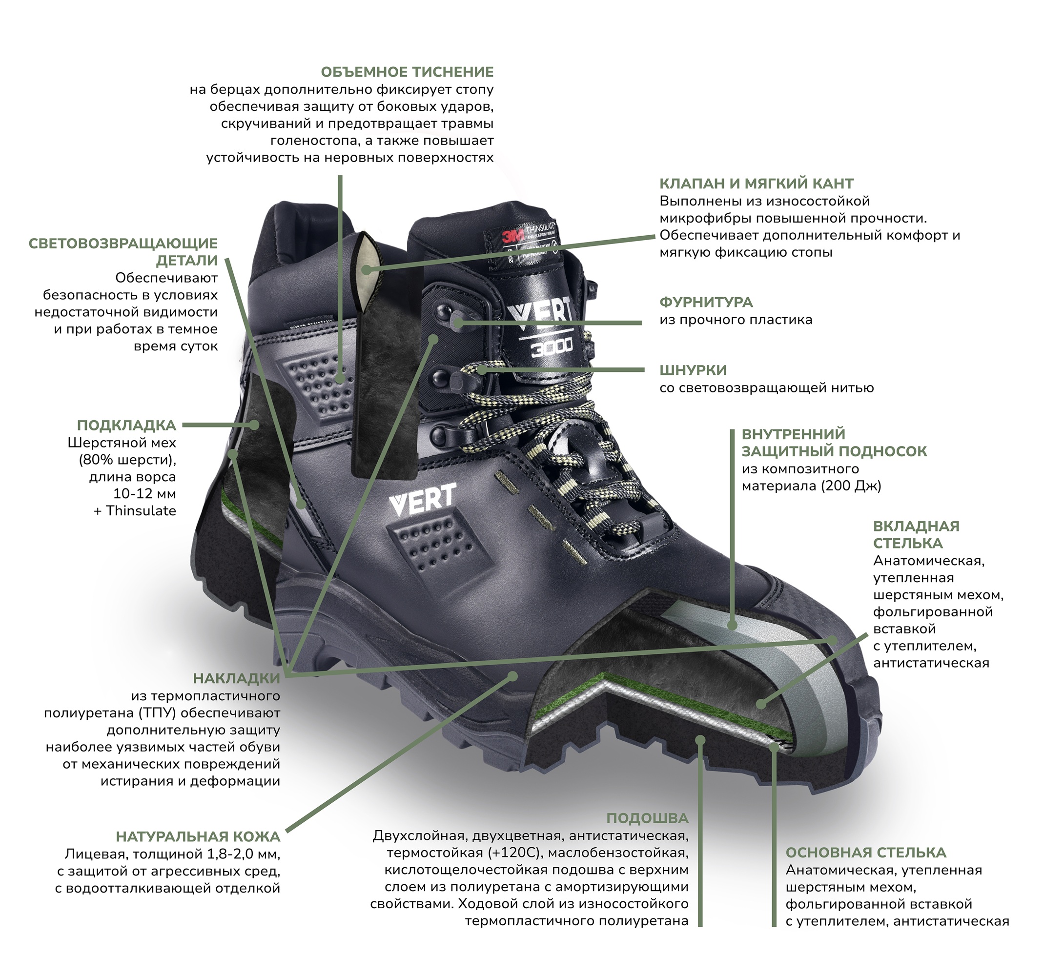 Обувь серии VERT 3000 — безупречное сочетание стиля, комфорта и современных технологий! Коллекция отличается стильным дизайном, использованием высококачественных современных материалов и уникальной колодкой повышенного комфорта. Анатомическая стелька помогает минимизировать утомляемость и обеспечивает отличную поддержку стопы даже при длительной носке. Обувь серии VERT 3000 гарантирует надежную защиту от агрессивных сред и механических воздействий, что делает ее идеальным выбором для работы в самых разных отраслях промышленности. Высокие стандарты качества и технологичные решения обеспечивают безопасность и комфорт в любых условиях. VERT — защита и стиль без компромиссов!