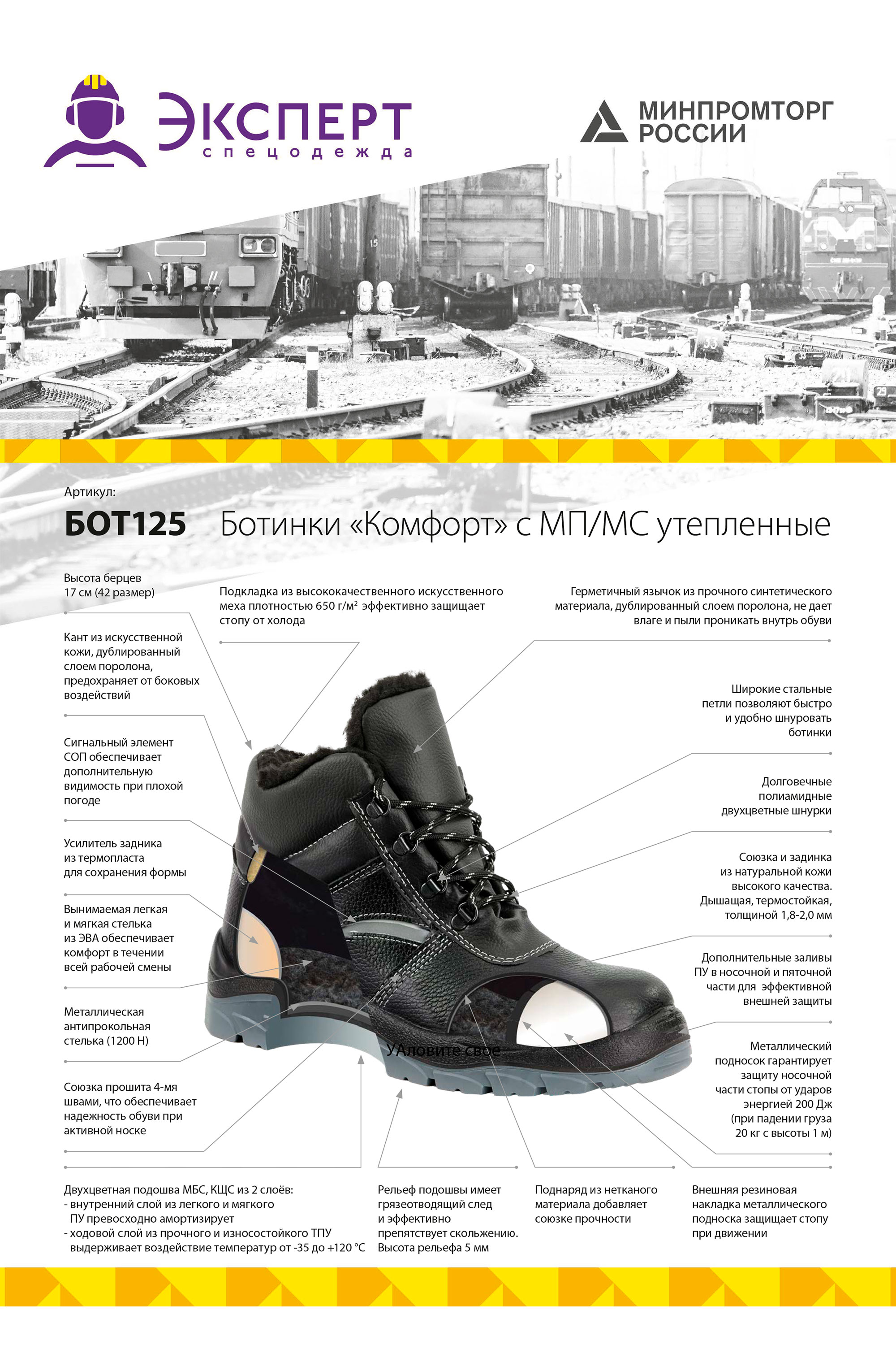 ■ Стелька: антипрокольная металлическая обеспечивает защиту стопы от прокола (1200Н); вкладная мягкая, амортизирующая на основе ЭВА, утепленная искусственным мехом, эффективно распределяет нагрузку по всей поверхности стопы.