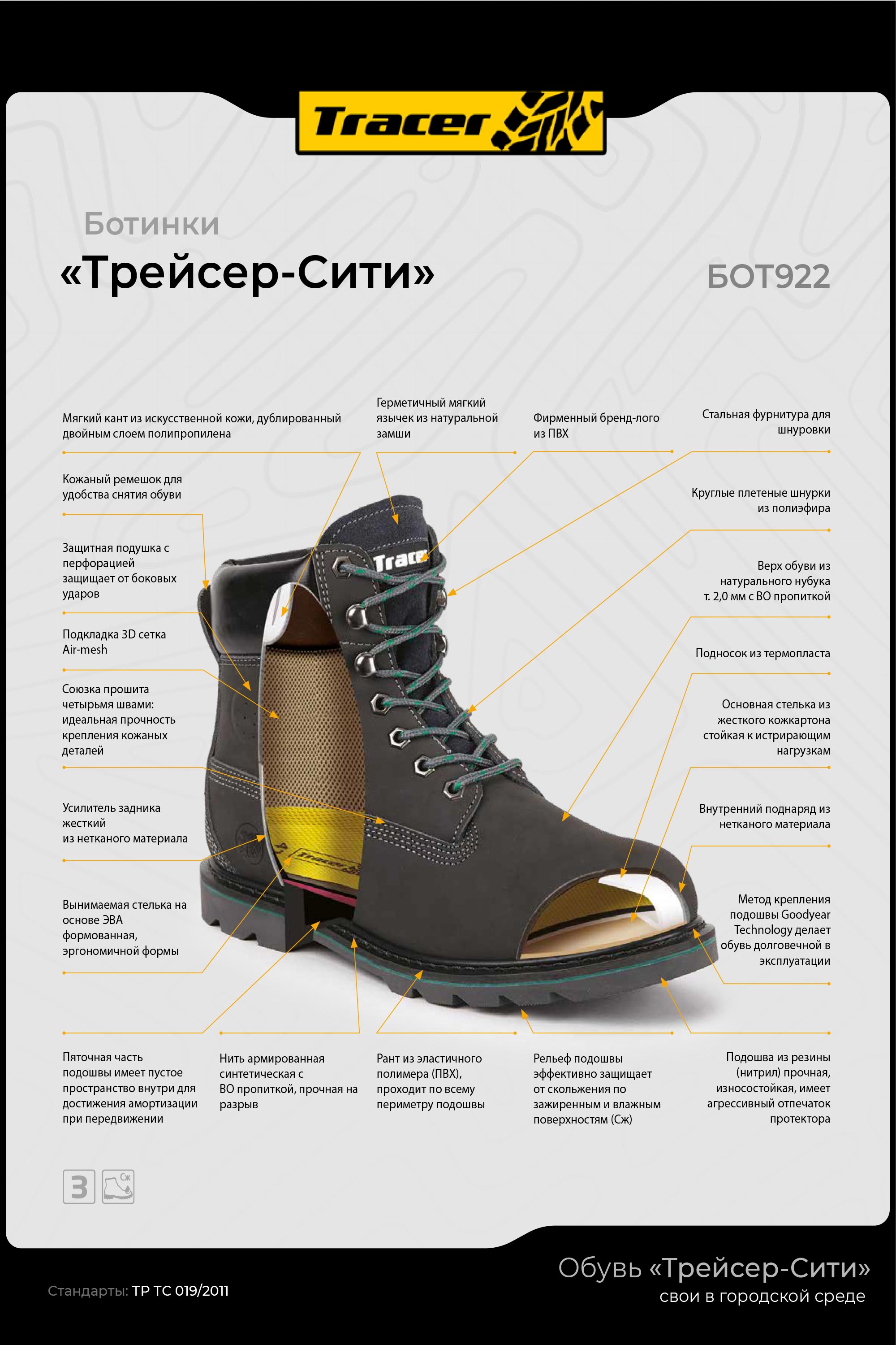 ■ Подошва: из резины (нитрил), обладает износостойкостью и повышенной прочностью, двухцветная, имеет агрессивный отпечаток протектора (глубина 6,0 мм), который защищает от скольжения по скользким зажиренным поверхностям, за счет своей конфигурации, обладает эффектом самоочищения от грязи. Внутренняя часть подошвы (подложка) и рант, проходящий по всему периметру подошвы, изготовлены из прочного эластичного полимера поливинилхлорида (ПВХ). Метод крепления подошвы: рантоклеепрошивной «Goodyear welted»: кожаный верх обуви крепится к подошве с помощью комбинации двойной прошивки и термо-адгезии подошвенных деталей, этот способ крепления считается исключительно надежным и долговечным.