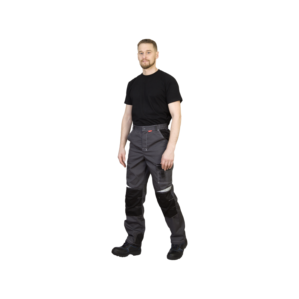 Брюки прямые; с застёжкой гульфика на тесьму - «молния»; с застежкой пояса на одну петлю и пуговицу; с боковыми внутренними карманами; с карманами и фигурными клапанами застегивающиеся на потайную липучку на боковом шве; с фигурным карманом на задней половинке; с карманами под инструменты; с наколенниками. Пояс брюк частично стянут резинкой ткацкой по бокам. В брюках предусмотрена лента светоотражающая (мелкодисперсная белая) 50 мм фигурной формы.