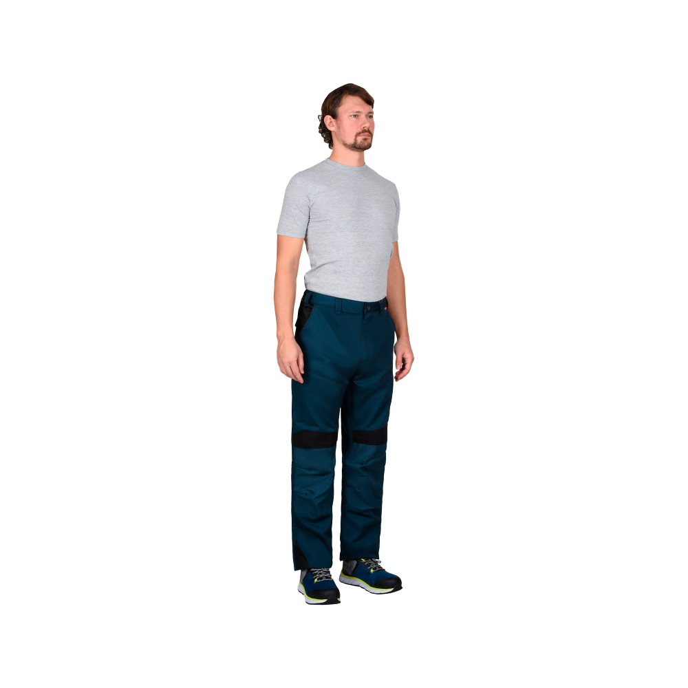 Брюки прямые с застёжкой спереди - гульфик с молнией, с отрезным поясом, с карманами спереди, сзади и на боковых швах, с объёмными наколенниками из плотной, полиэфирной, непромокаемой ткани с верхним входом для амортизационного вкладыша.