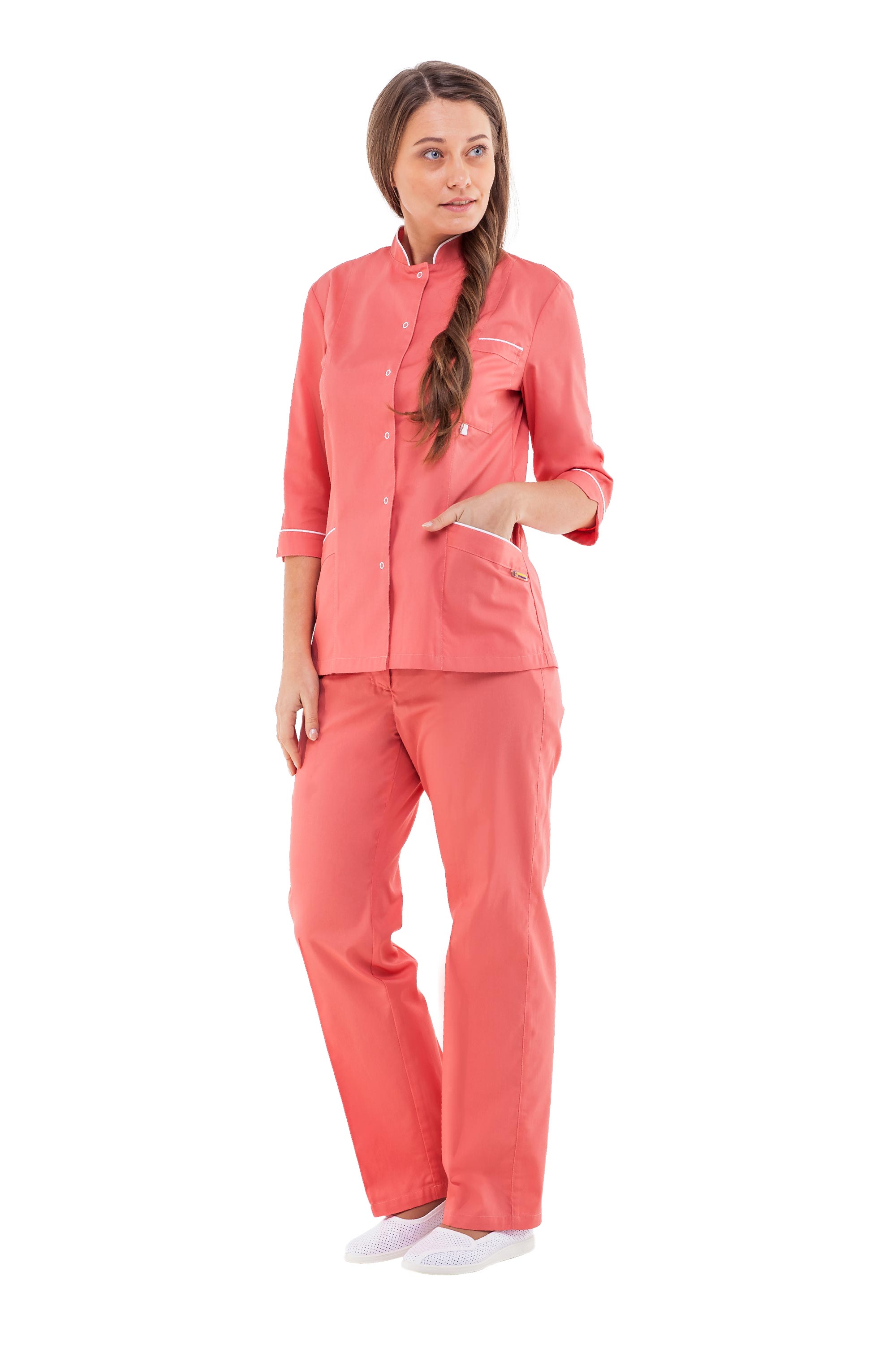 Брюки с притачным поясом с эластичной тесьмой, с шлевками для ремня. Застежка в среднем шве на молнию. Передние части брюк с боковыми внутренними карманами.