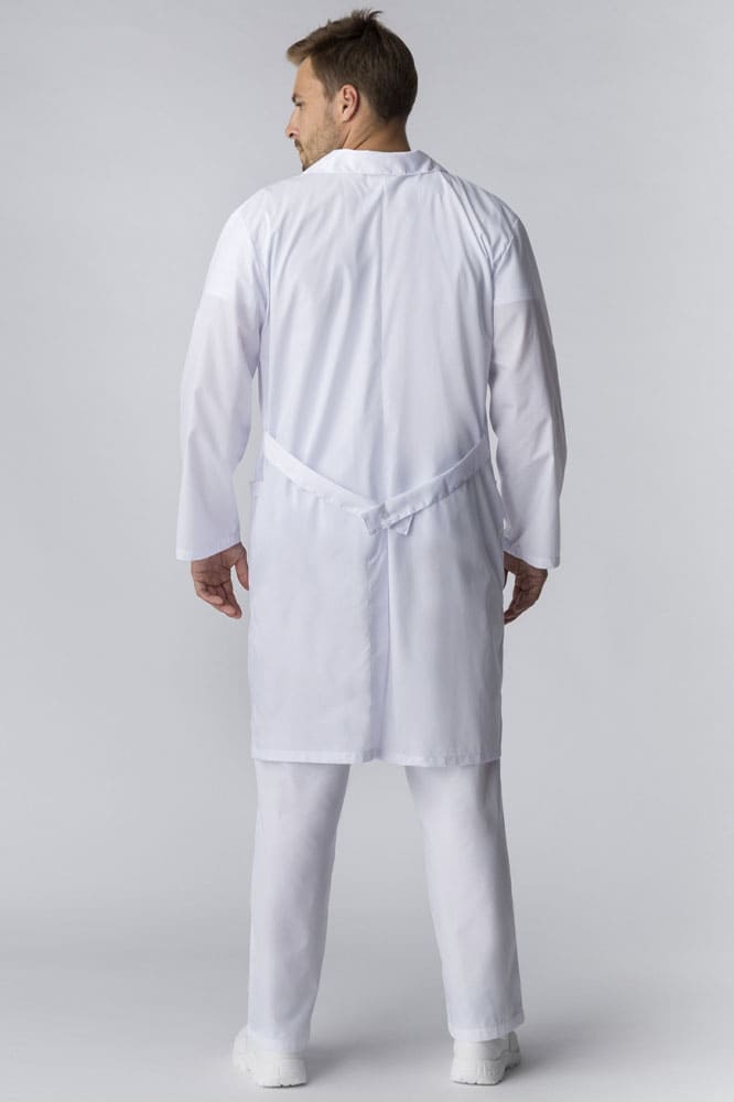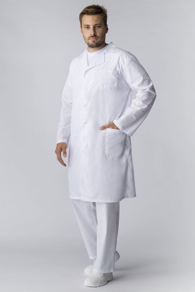 Халат рабочий мужской «Классика» предназначен для работы на производствах, в медицинских и образовательных учреждениях. Халат белый рабочий изготовлен в соответствии с ГОСТ из высококачественных материалов для комфортной деятельности в разных температурных режимах. Плотная ткань с водоотталкивающей пропиткой надежно защищает от загрязнений разного типа, отличается износостойкостью, длительным периодом эксплуатации, не просвечивает. Халат с длинным рукавом и длиной ниже колена застегивается на пуговицы, очень удобен в носке. Рабочая одежда регулируется по талии с помощью вшивного пояса на кнопке. В объемных боковых карманах удобно хранить записи и мелочи. Двойной нагрудный карман отличается повышенной прочностью и создан для размещения острых предметов.