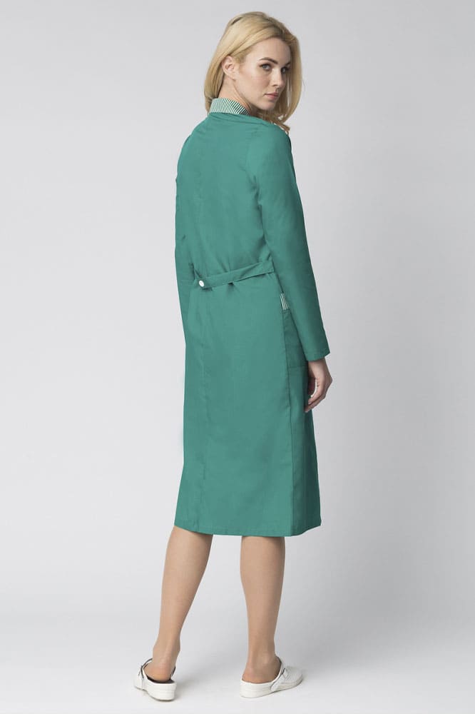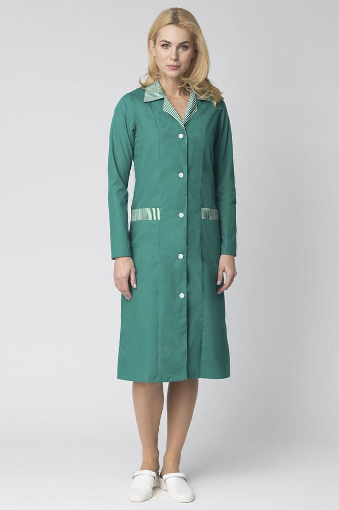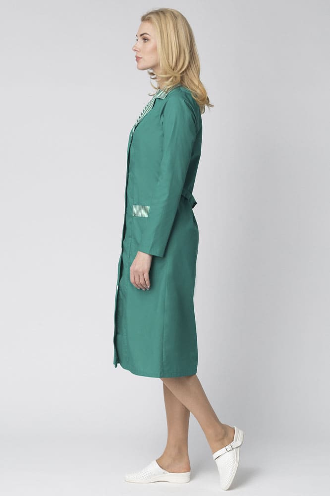 - контрастной принтованной тканью в полоску отделаны воротник и карманы