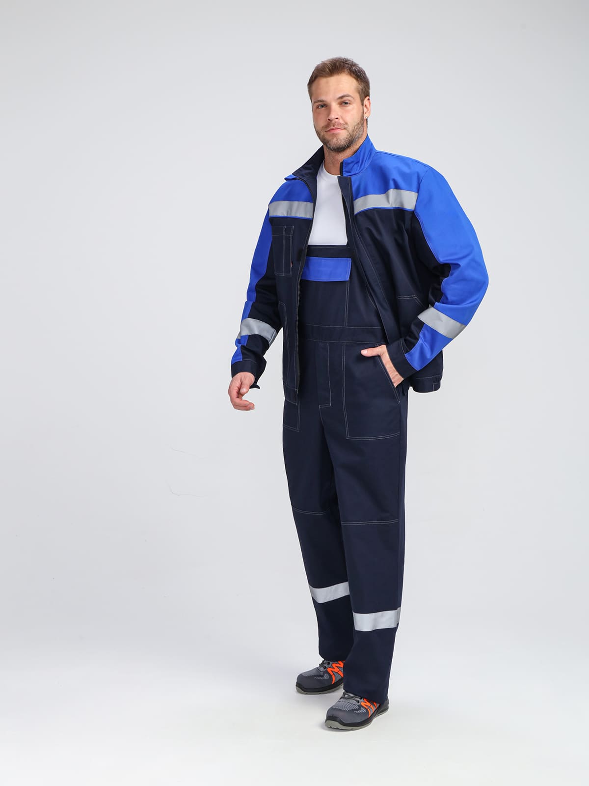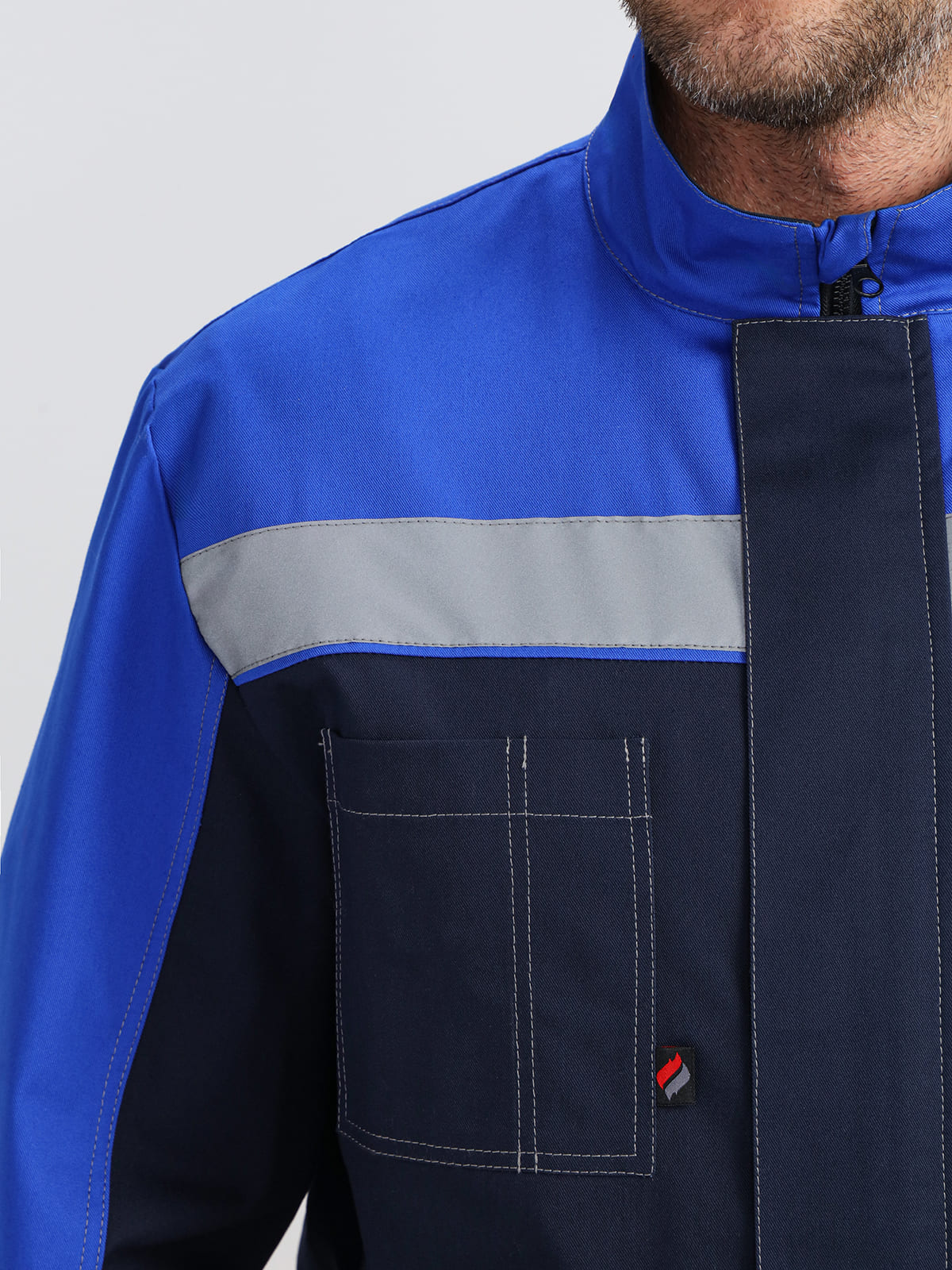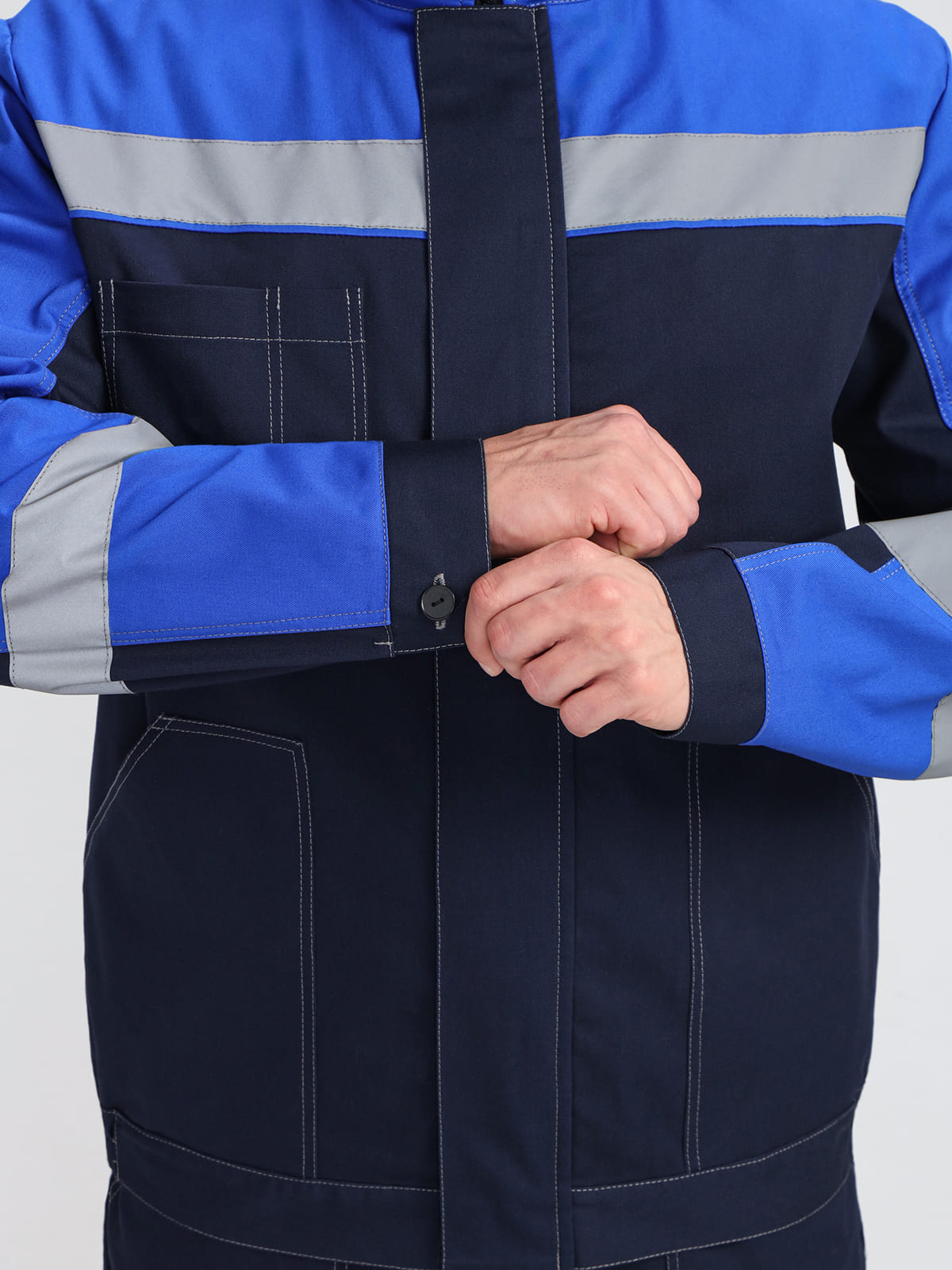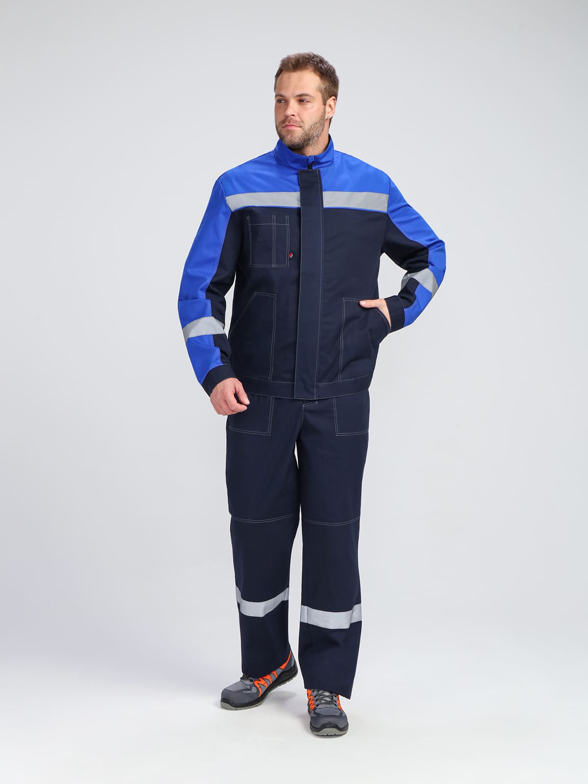 - Широкая светоотражающая полоса по низу кокеток и на рукавах для безопасности