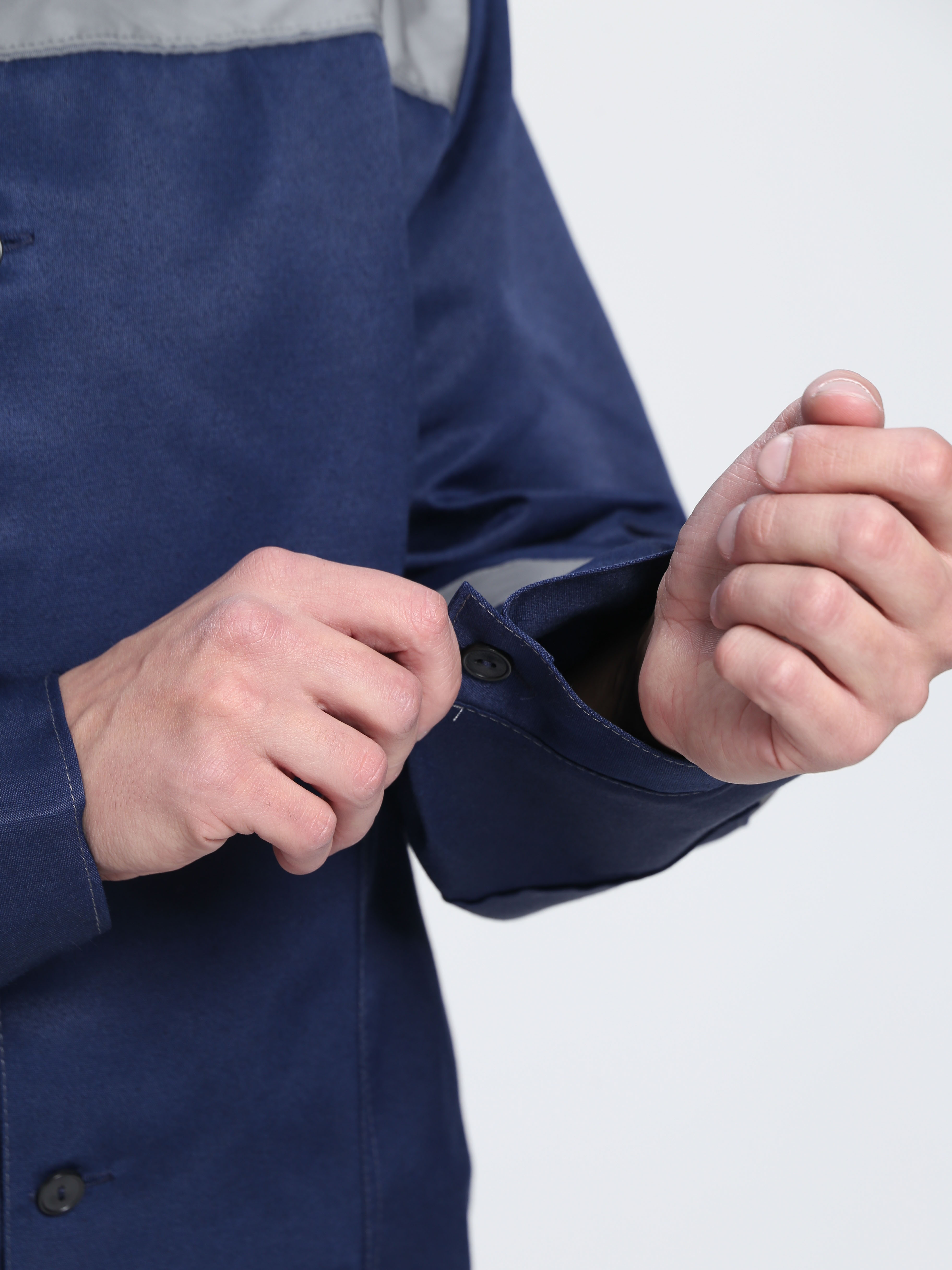 Усиленные Накладки: Костюм оснащён усиленными накладками на коленях и локтях, что предотвращает быстрый износ и обеспечивает дополнительную защиту при работе в условиях повышенной физической нагрузки.