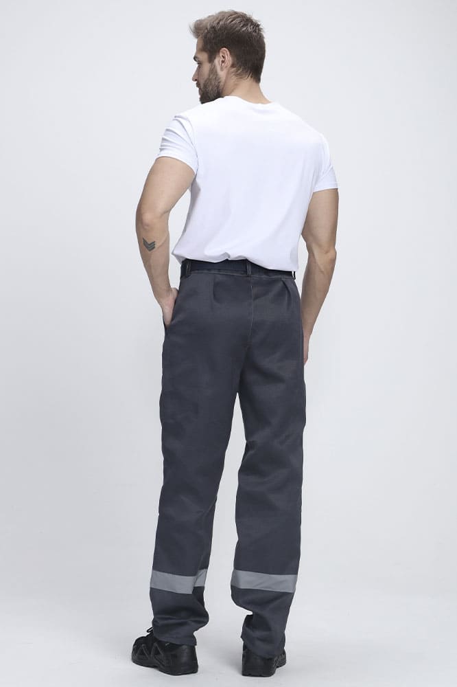 Брюки прямые с застежкой в переднем шве на 3 петли и пуговицы и 1-ой петлей на поясе, боковые накладные карманы на передних половинках, усиленные накладки на коленях