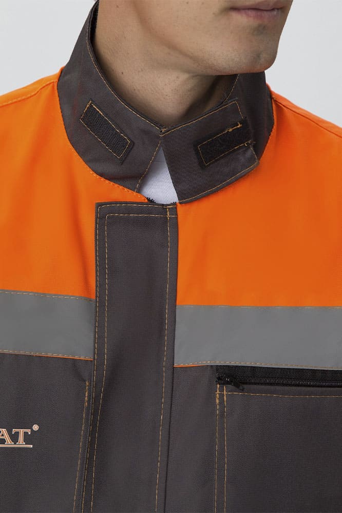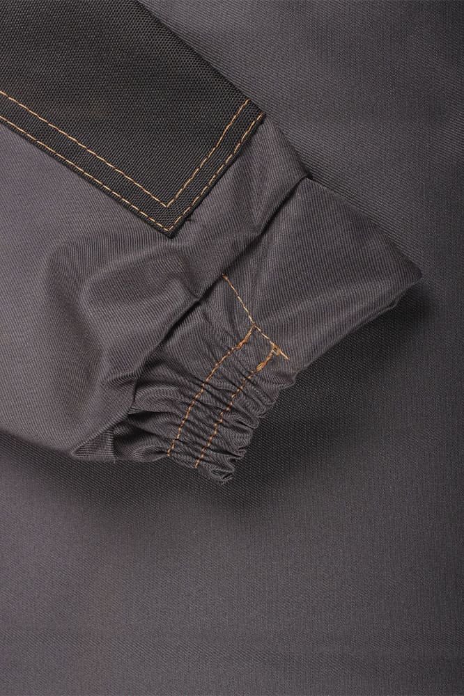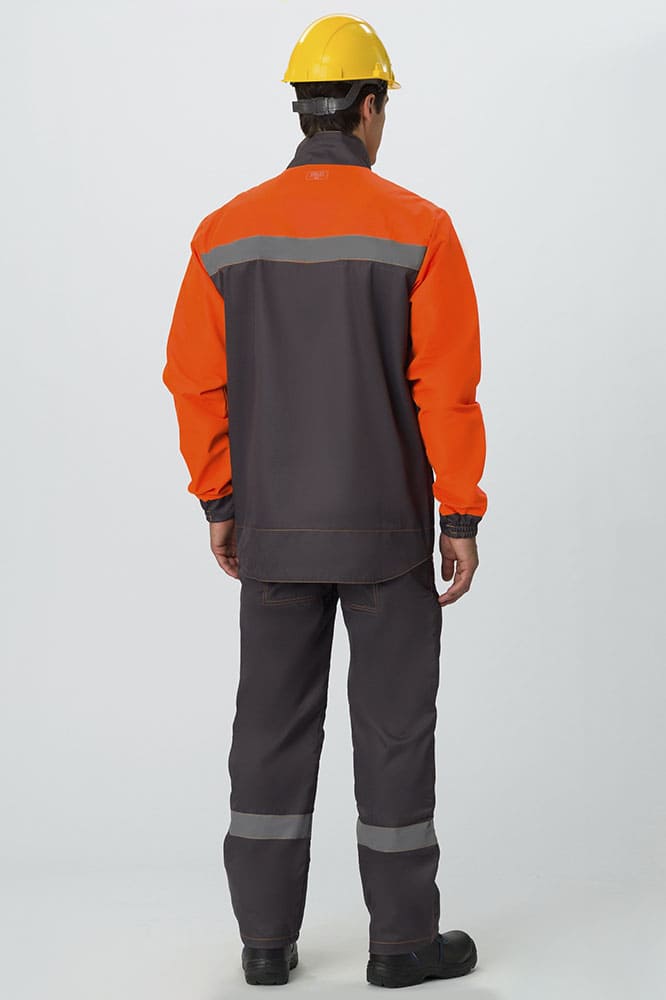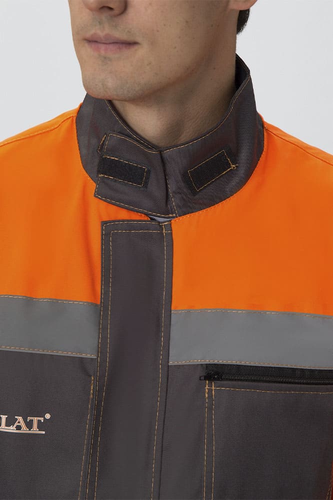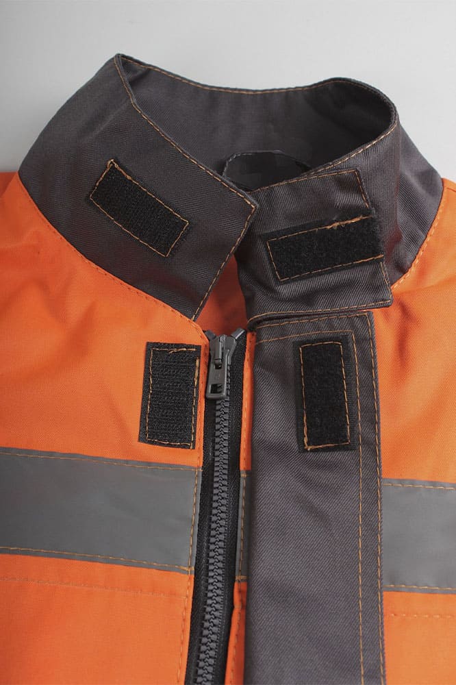 - воротник стойка с застежкой на контактной ленте, рукава втачные с притачными манжетами на резинке. Кокетки переда, спинки и рукава из сигнальной ткани яркой цветовой гаммы