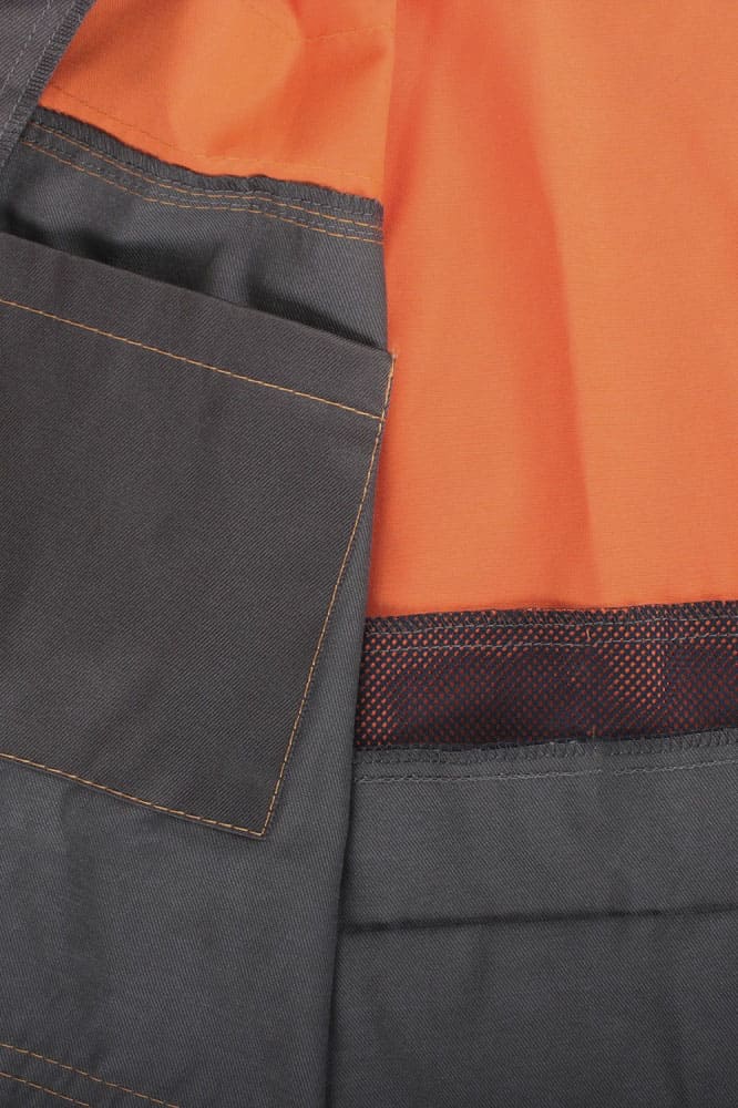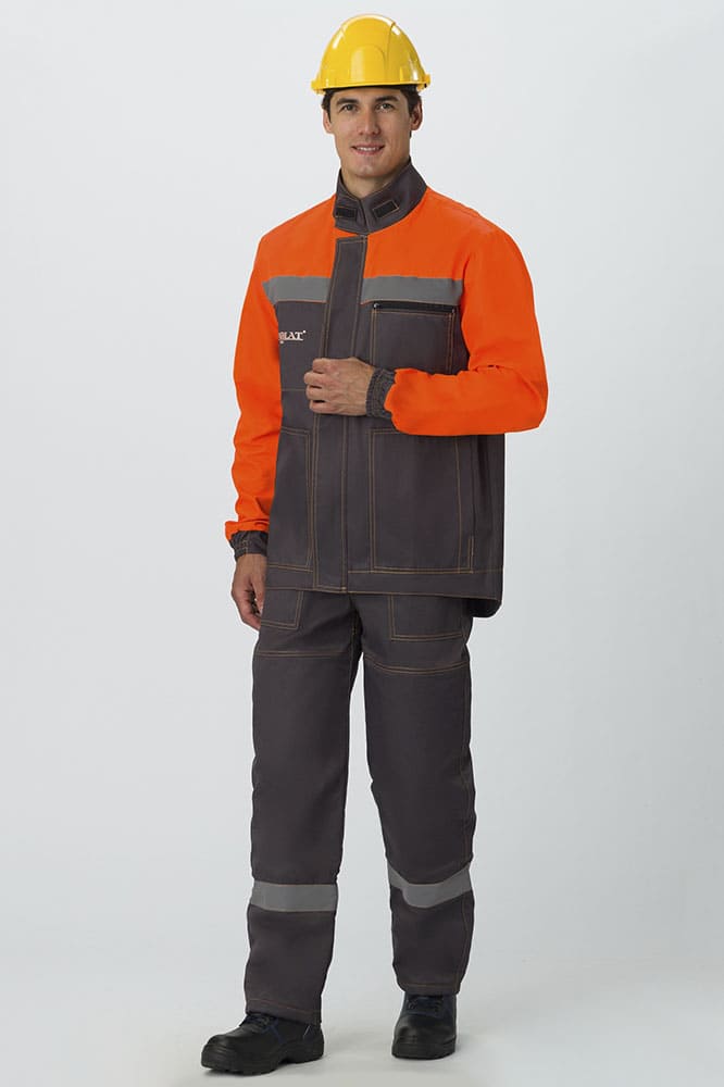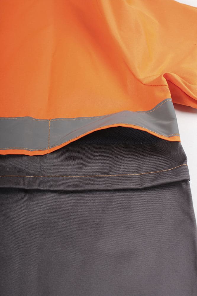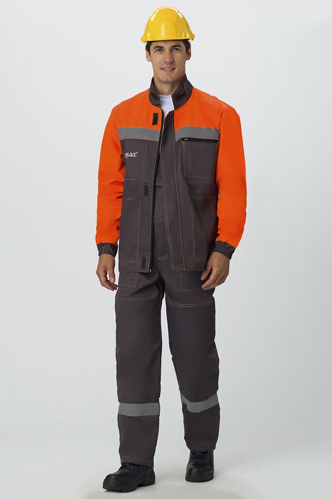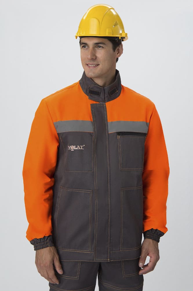 - воротник стойка с застежкой на контактной ленте, рукава втачные с притачными манжетами на резинке. Кокетки переда, спинки и рукава из сигнальной ткани яркой цветовой гаммы