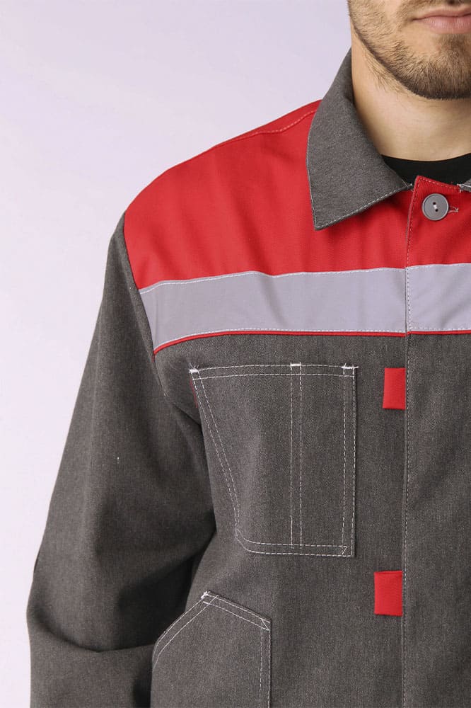 Костюм испытан в реальных рабочих условиях и получил положительные отзывы от работников разных специальностей. Благодаря высокому содержанию хлопка, ткань дышит, хорошо впитывает влагу и отводит ее от тела. Высокопрочные полиэфирные волокна обеспечивают прочность, малоусадочность и легкость в уходе. Накладные детали настрочены двойной строчкой.