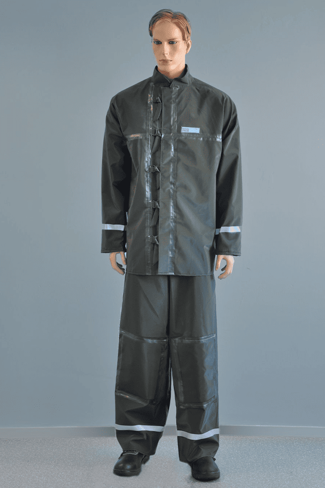 1. Ткань: костюм изготовлен из специальной прочной ткани с ПВХ покрытием, вес ткани 500 гр. / кв. м. Водоупорность — не менее 10.000 мм. вод. столба. Повышенные прочностные характеристики. Очень высокие показатели износостойкости. Цвет: зеленый. Ткань экологична и соответствует Европейскому стандарту EN 71 PART3