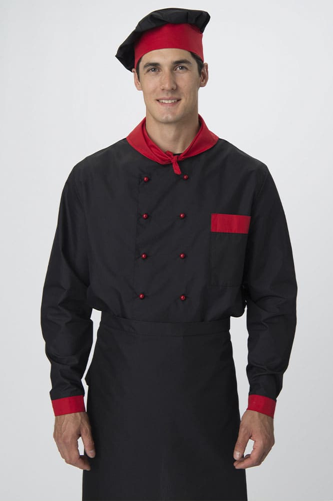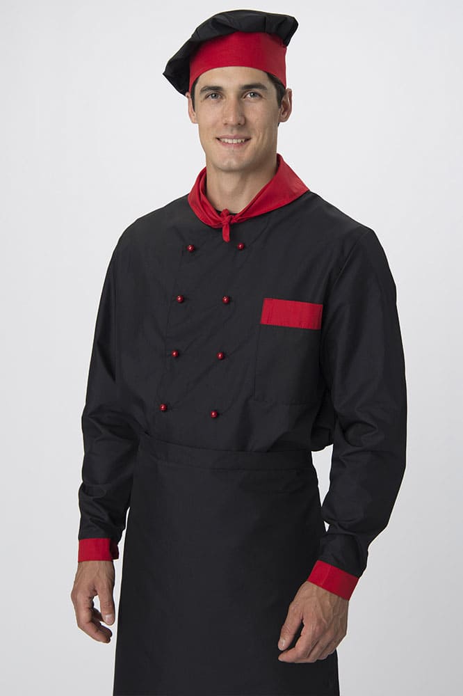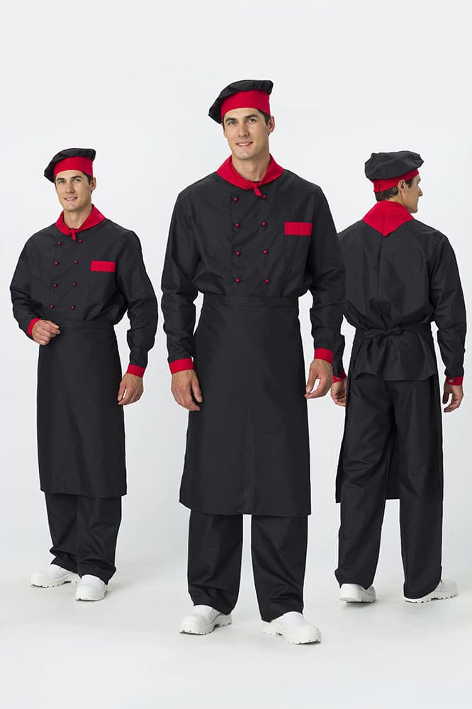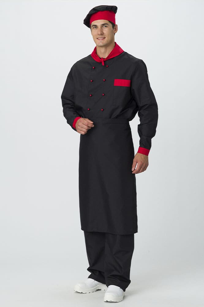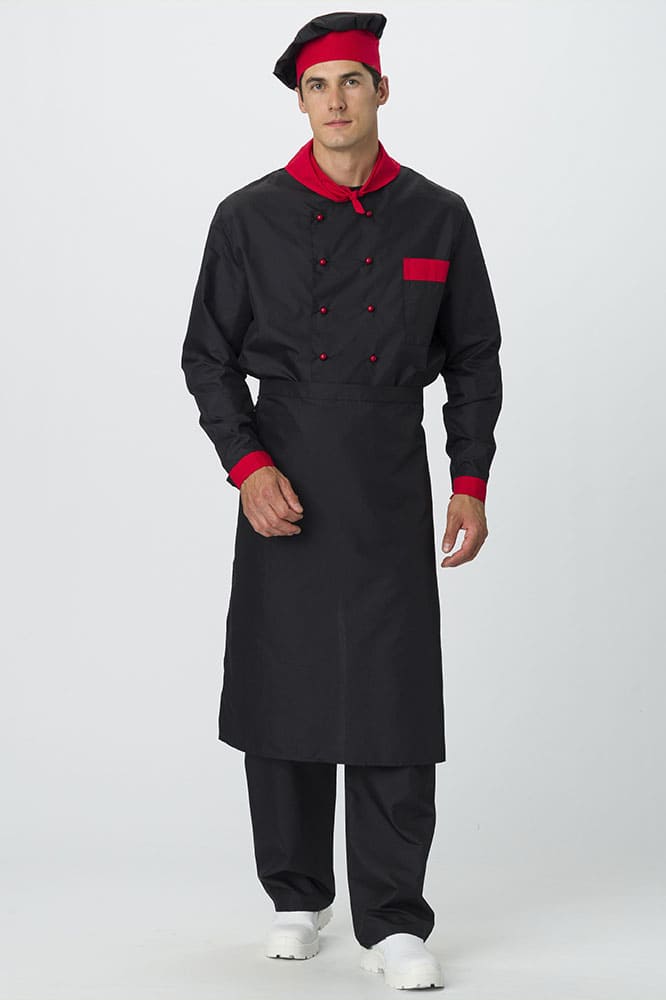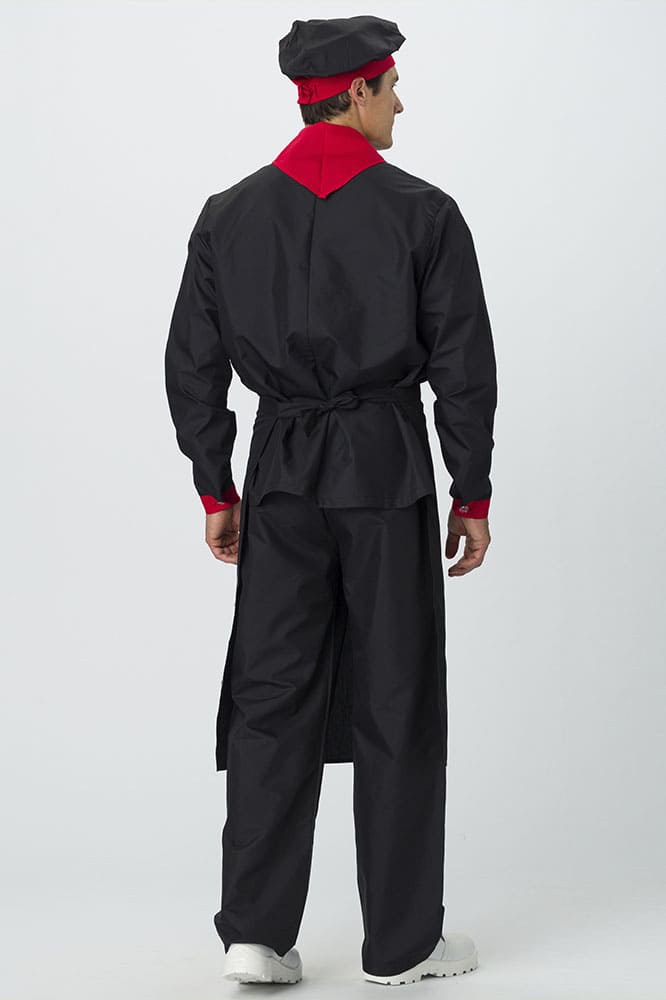 Костюм для повара «Су-Шеф» состоит из 5 предметов: китель повара, брюки, поварской колпак, фартук для повара, платок нашейный. Костюм поварской выполнен в стильном черном цвете с декоративной отделкой красными элементами. Плотная ткань с водоотталкивающей пропиткой обеспечивает костюму длительный срок службы, отлично отстирывается от загрязнений. Китель для повара с длинными рукавами оснащен двубортной застежкой на пукли и воротником с U-образным вырезом. Нагрудный карман подходит для хранения записей. Прямые брюки с поясом на резинке отлично сидят по фигуре и идеально дополняют китель. Колпак повара универсален: высота тульи 10 см, общая высота – 28 см. Регулируется по объему головы с помощью завязок на затылке. Фартук поварской без грудки завязывается на талии. Треугольный платок на шею 34*68 см выступает стильным элементом рабочей одежды.