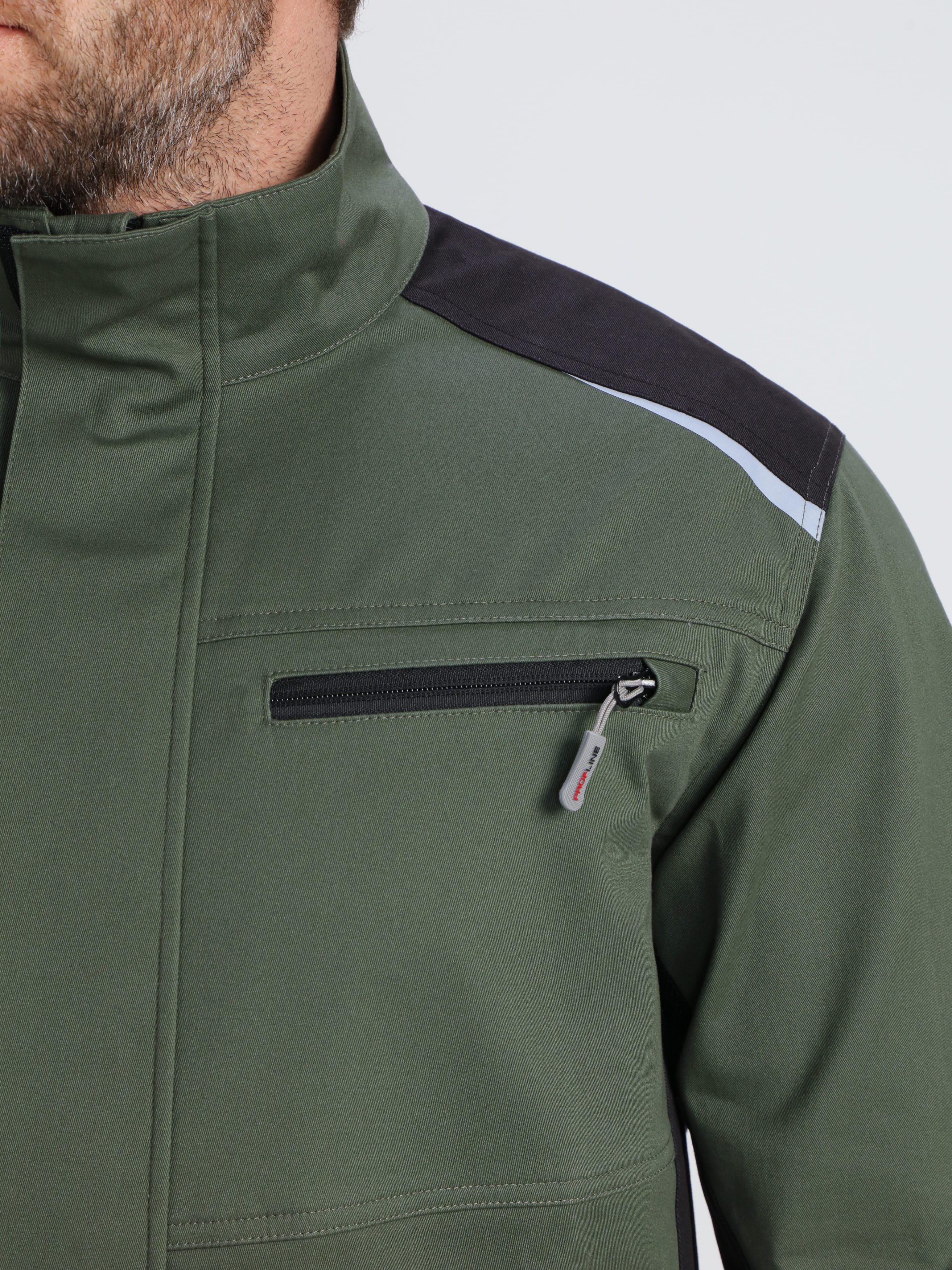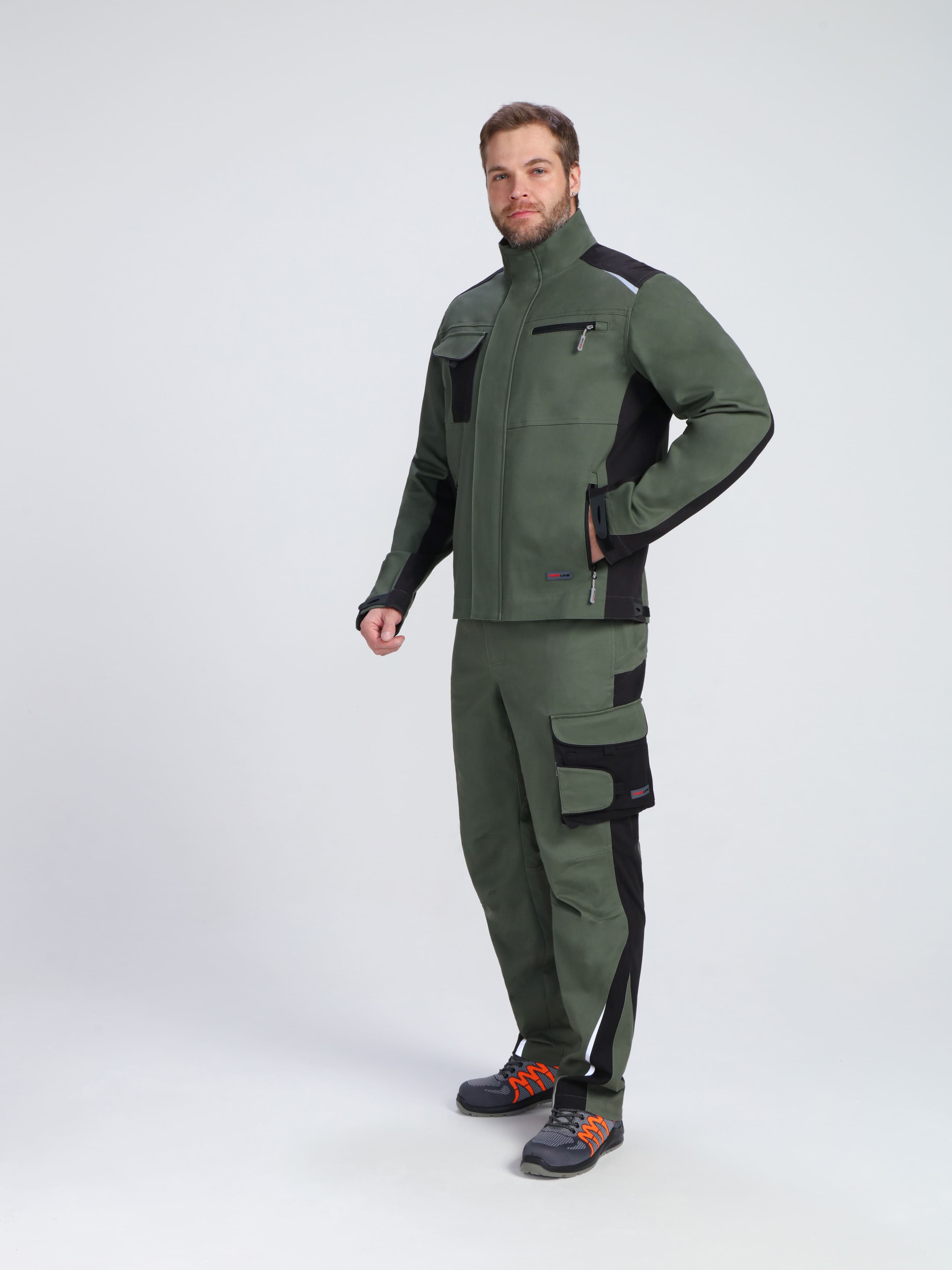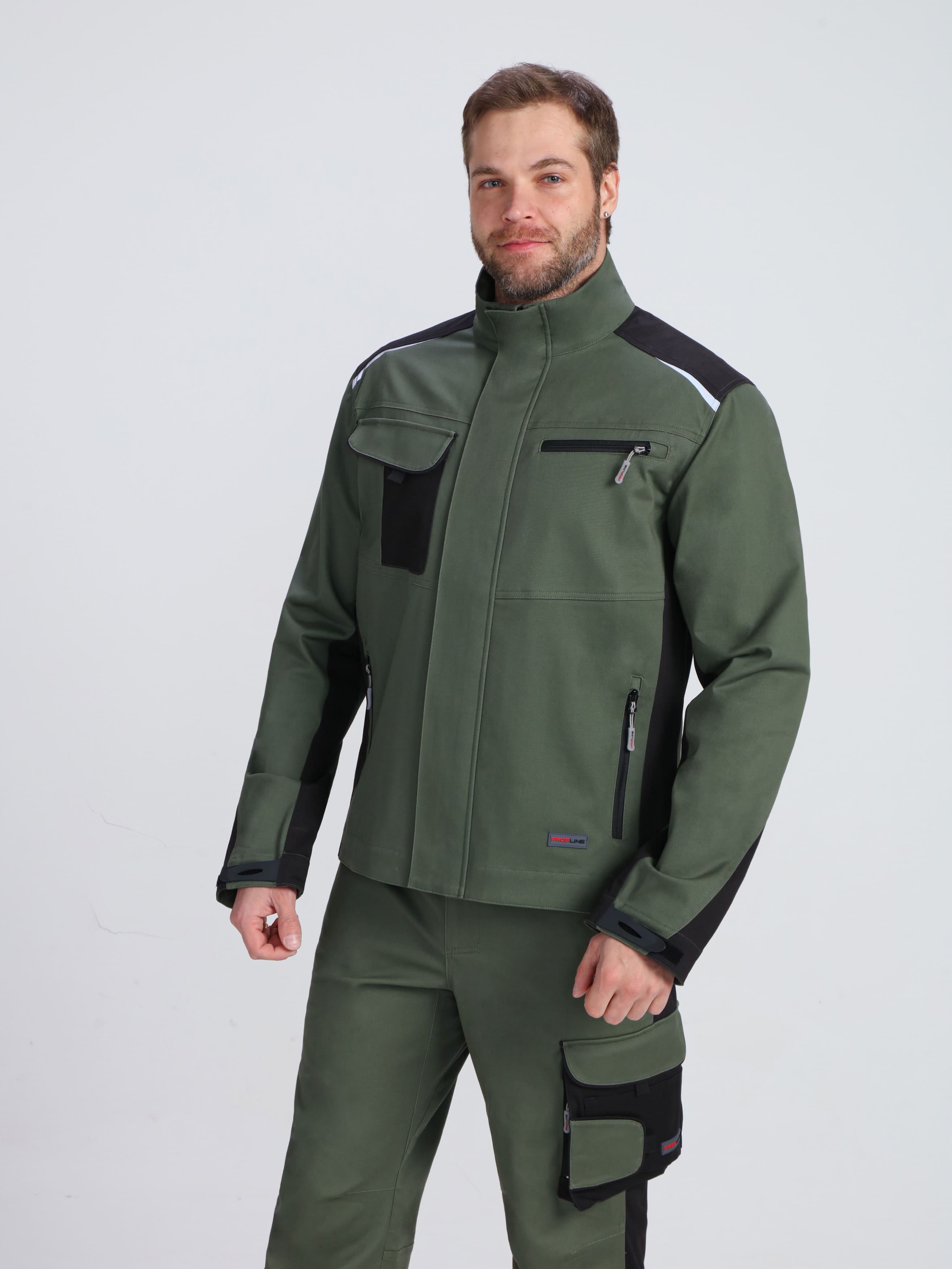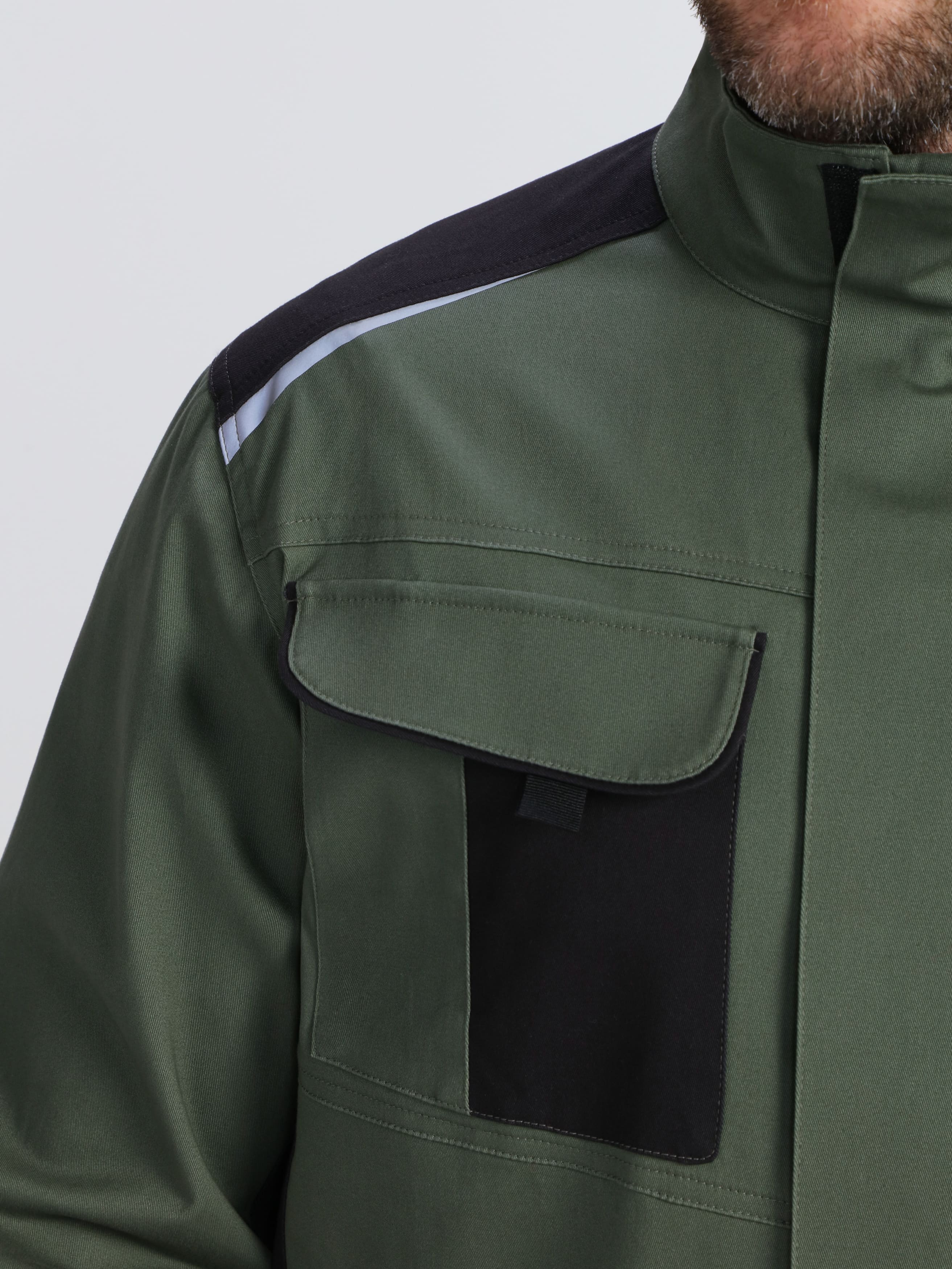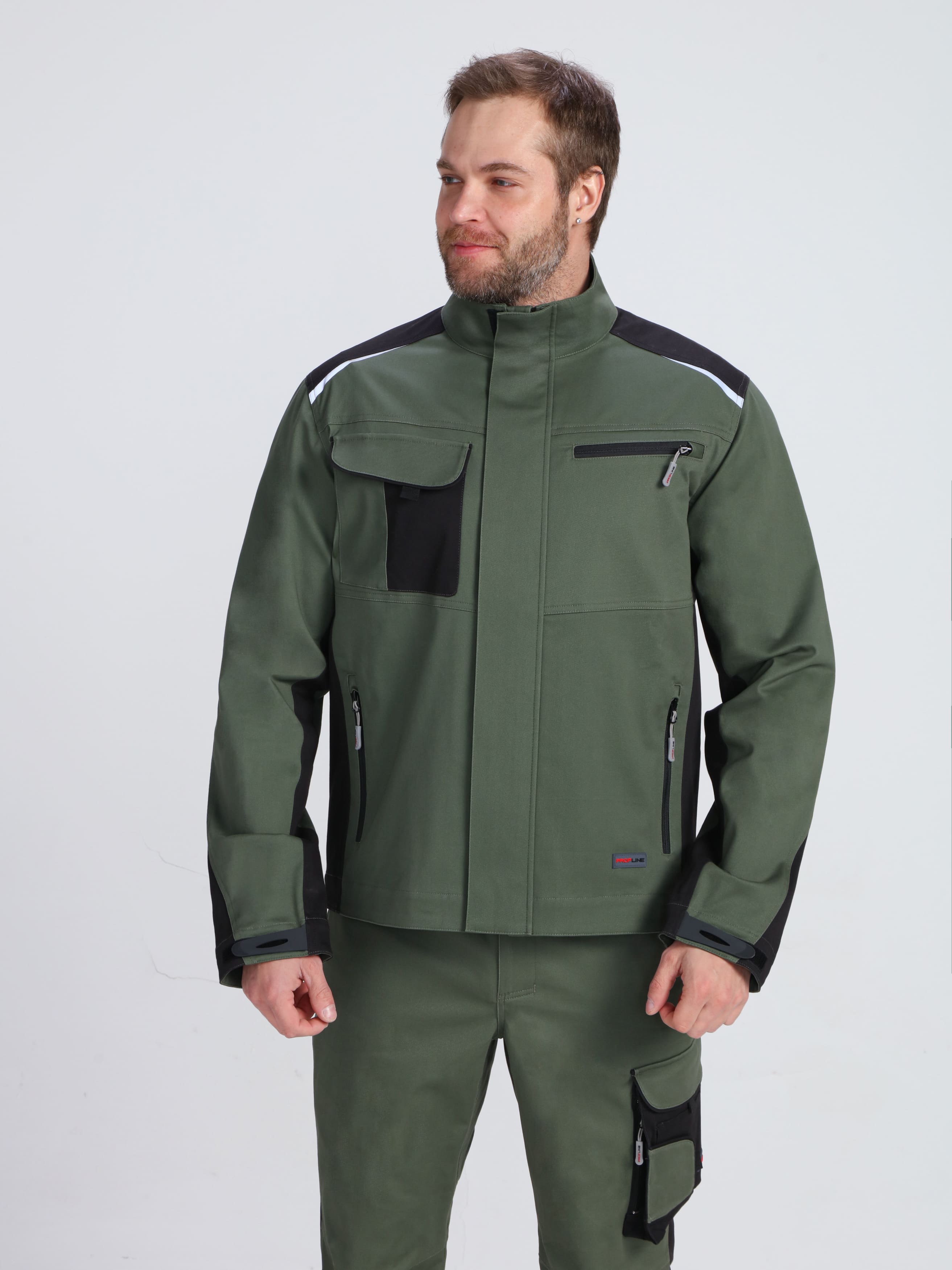 - Продуманная система карманов: 4 функциональных кармана, включая двухсекционный нагрудный с клапаном и петлей для бейджа, а также вертикальные прорезные с молнией для безопасного хранения