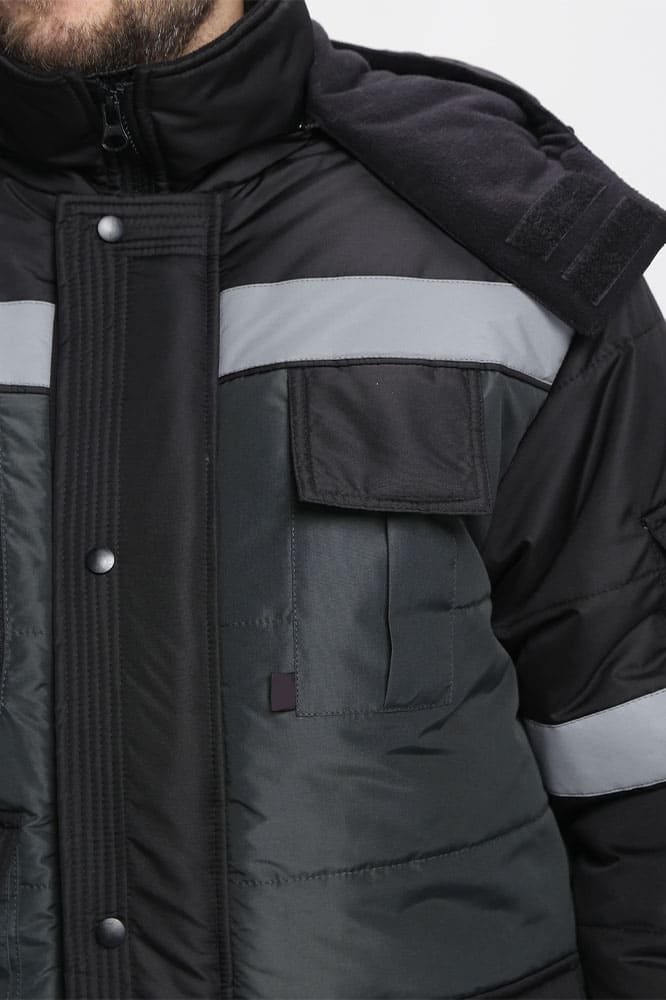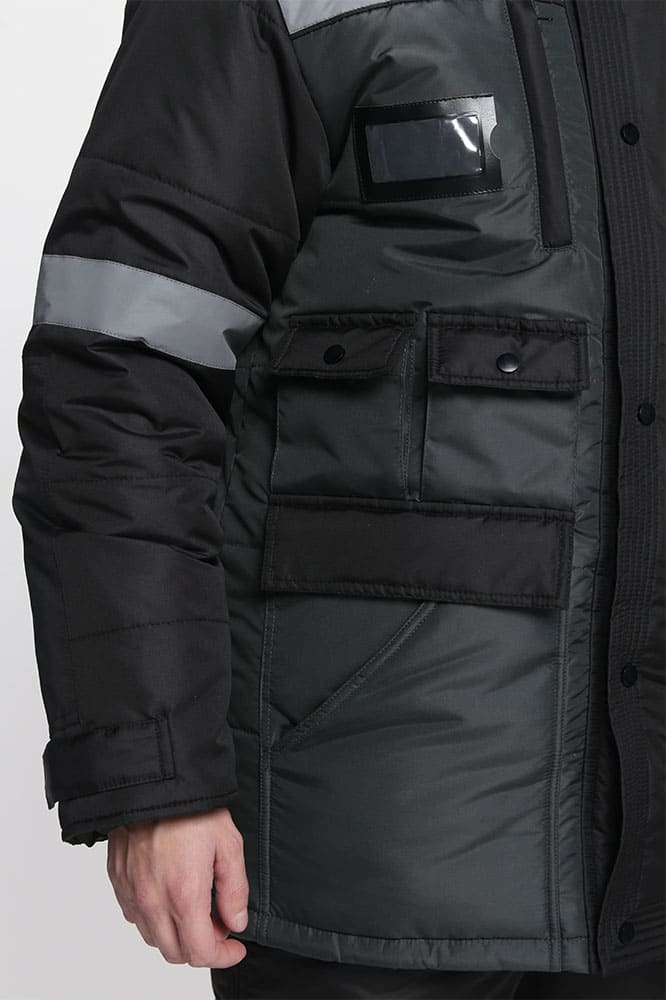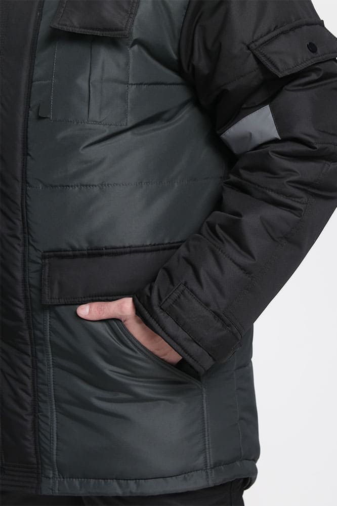 - нижние накладные карманы застегиваются на ленты контакт, состоят из двух частей внешней утепленной с косым входом, и внутренней с горизонтальным входом, вход в карман имеет снегоулавливатель