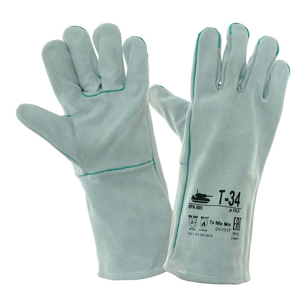 Перчатки сварщика (краги) Т-34 спилковые серые без подкладки предназначены для защиты рук от механического воздействия (истирание, прокол, порез), искр и брызг расплавленного ме-талла и работ в условиях повышенных температур. Краги изготовлены из качественного шлифованного кожевенного спилка крупного рогатого скота сорта АВ. Швы прошиты усиленными нитками и усилены вставками из кожи зеленого цвета. Внутри краги имеется вшивной ярлык с дополнительной информацией о продукции.