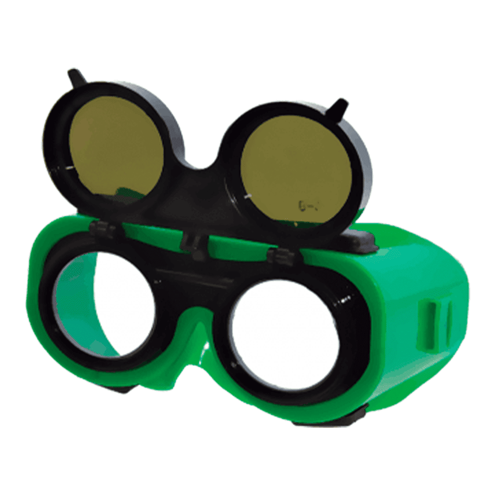 Очки современные, удобные, с высокими эксплуатационными свойствами состоят из мягкого корпуса из ПВХ пластиката, в котором установлен жесткий стеклодержатель с прозрачными пластмассовыми защитными стеклами Plexiglas CE и откидного стеклодержателя с минеральными защитными стеклами-светофильтрами.