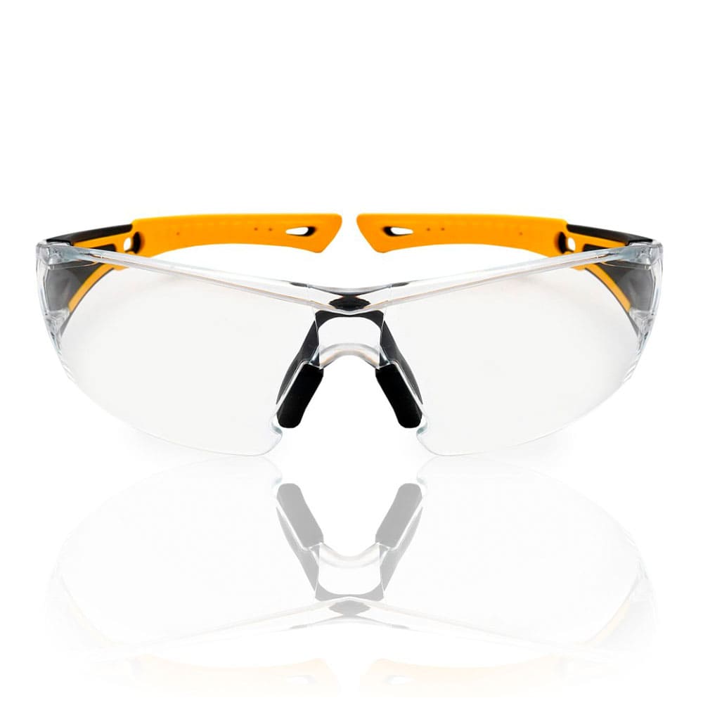 Защитные очки последнего поколения с двухцветными мягкими дужками, сделанными с применением инновационного материала ТЭП (термоэластопласт), с панорамными линзами, которые обеспечивают улучшенный обзор и защищают глаза от попадания летящих частиц.