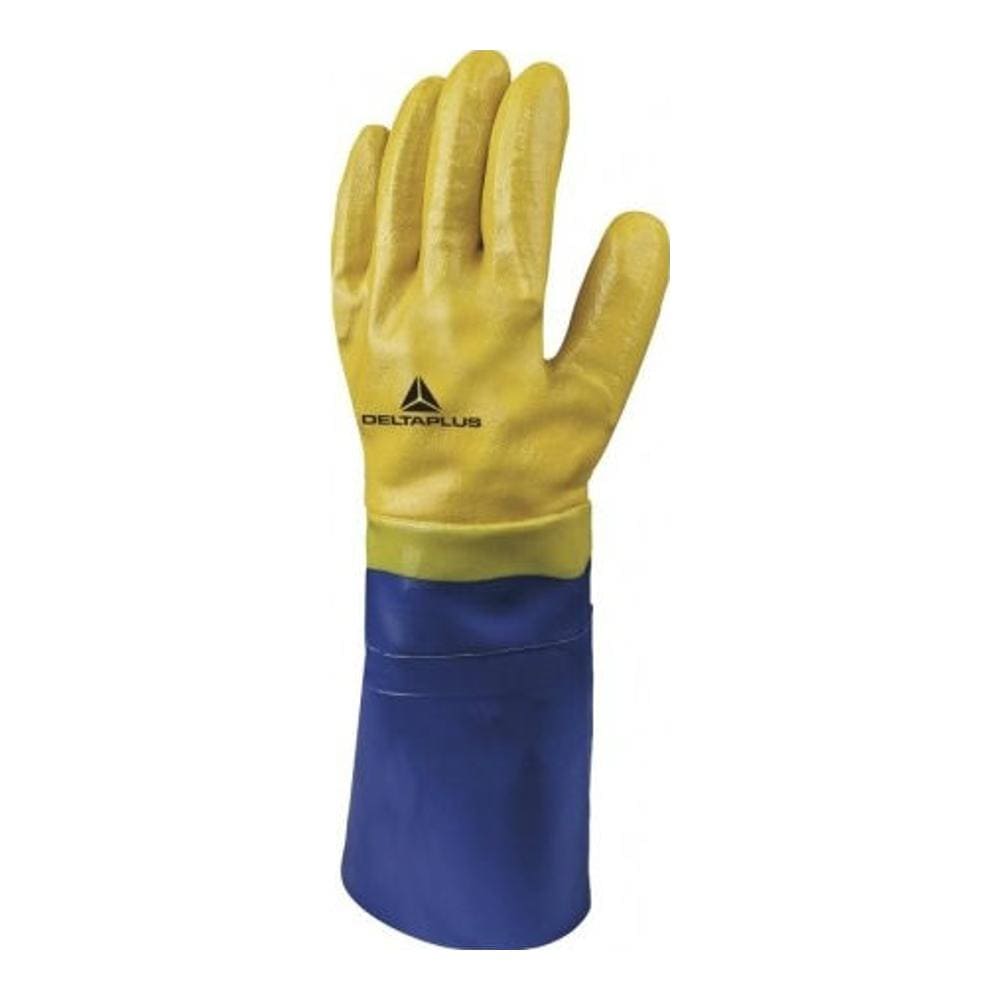Удлиненные трикотажные перчатки с двойным нитриловым покрытием. Длина перчаток - 40 см. Манжета из искусственной кожи. На тыльной стороне и пальцах внутри перчаток расположены рельефные накладки из неопрена. Высокая устойчивость к истиранию. Устойчивость к ударному воздействию в области запястья. Устойчивость к воздействию масел. Перчатки водонепроницаемы и герметичны.