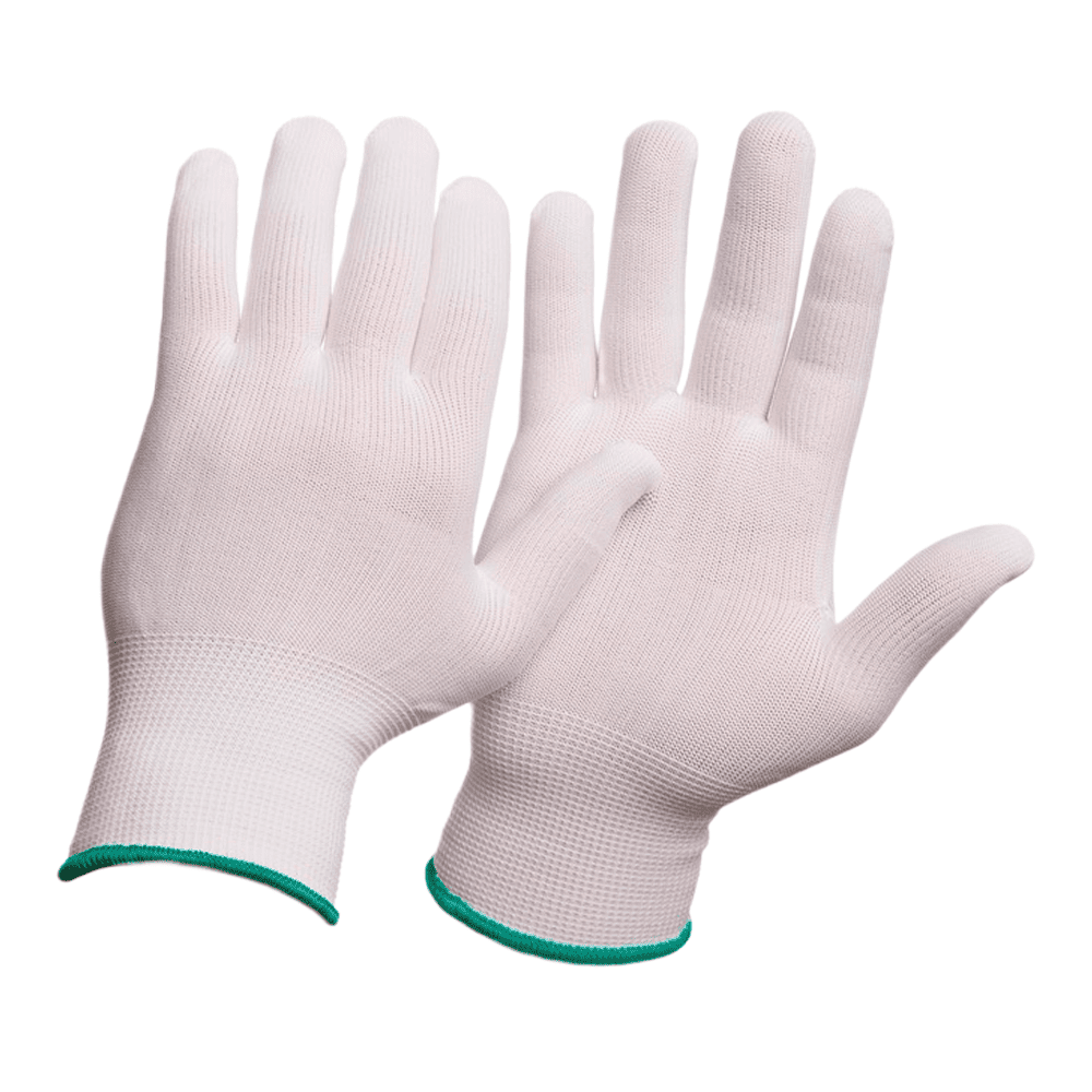 Чистые перчатки из белой нейлоновой пряжи. Бесшовная основа 13го класса вязки прекрасно вентилируется и не оставляет ворсинок. Универсальны, применяются для любых механических работ. Двойной оверлок с латексным кольцом обеспечивает превосходную фиксацию перчатки на запястье.Цветная индикация размера по оверлоку.