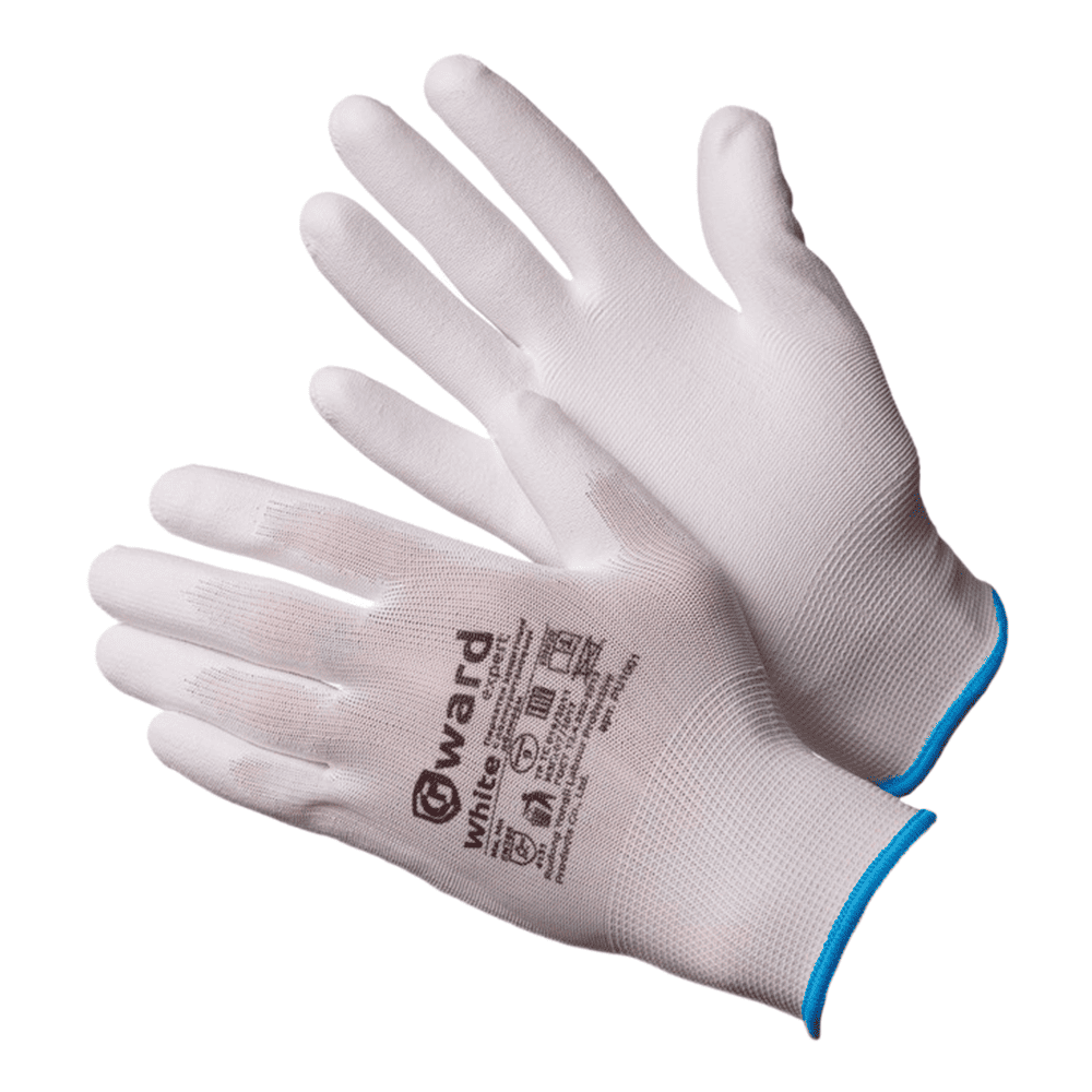 Нейлоновые перчатки белого цвета, покрытые полиуретаном белого цвета. Бесшовная основа 13го класса вязки прекрасно вентилируется и не оставляет ворсинок. Универсальны, применяются для любых механических работ. Тонкое полиуретановое покрытие одновременно очень прочное и чувствительное. Анатомическая форма перчатки снижает усталость рук при работе. Высокие показатели к истирательным и разрывным нагрузкам.