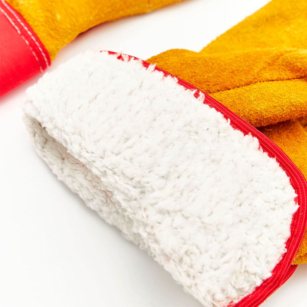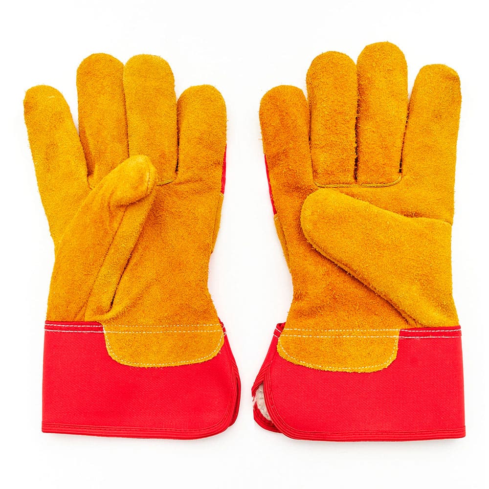 Перчатки для защиты от механических воздействий и пониженных температур, комбинированные, плотная смесовая ткань красного цвета со спилком защитная крага (прорезиненный жесткий защитный манжет), флисовая подкладка из хлопка на ладонной части и пальцах Спилок КРС- только спинная часть шкур, прошедших предварительный отбор ,спилок однородный, сорт АВ (1,4+/– 0,2 мм), шлифованный, желтого (золотого) цвета, двойные швы. Перчатки обеспечивают высокий комфорт, высокий уровень защиты от истирания и разрыва, хорошие показатели защиты от пореза и прокола. Перчатки рекомендованы для продолжительного ношения, могут быть использованы для проведения общих работ для защиты от пониженных температур механических воздействий в отсутствии жидких загрязнителей, таких как масло, водные растворы и тд, для защиты рук от ОПЗ