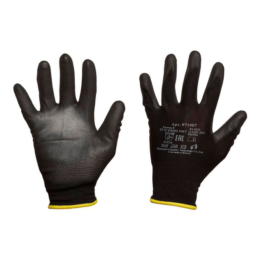 Черные нейлоновые перчатки с полиуретановым покрытием ладони и пальцев. Бесшовная «дышащая» основа из нейлона с плотностью вязки 13 петель на дюйм обеспечивает тактильную чувствительность. Полиуретановое покрытие дает эффект «липкости», что исключает проскальзывание предметов. Анатомическая форма снижает усталость рук.
