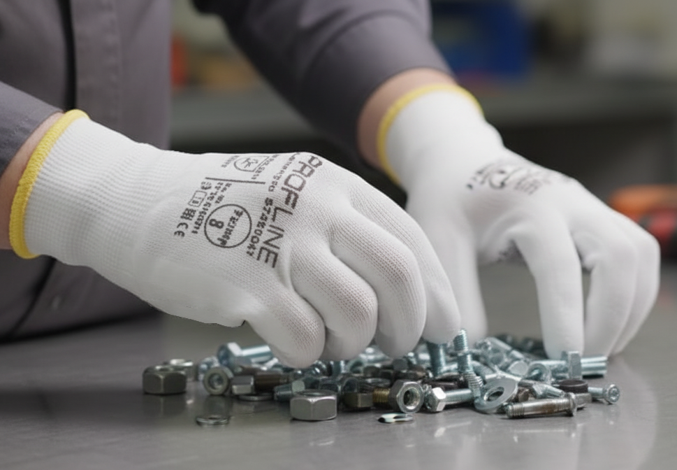 Белые нейлоновые перчатки с полиуретановым покрытием ладони и пальцев. Бесшовная «дышащая» основа из нейлона с плотностью вязки 13 петель на дюйм обеспечивает тактильную чувствительность. Полиуретановое покрытие дает эффект «липкости», что исключает проскальзывание предметов.