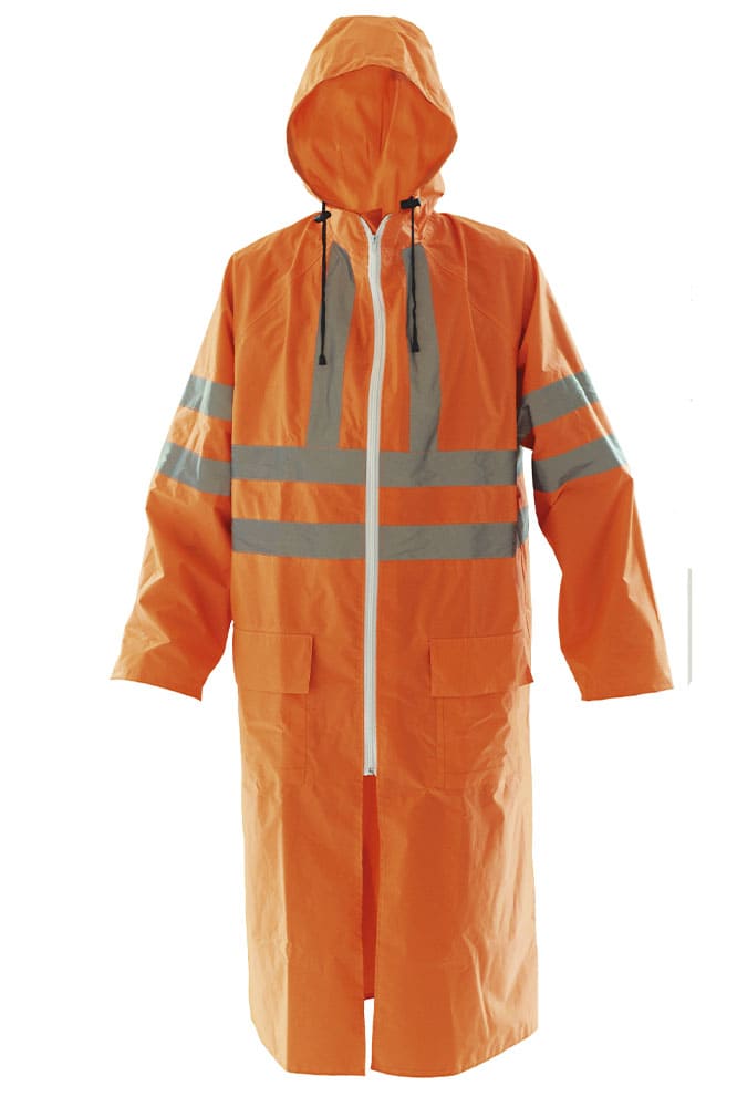 Плащ для защиты от воды с застежкой на молнию с ветрозащитной планкой, имеет капюшон, накладные карманы с влагозащитными клапанами, прошитые и герметично проклеееные швы, манжеты на рукавах. Спинка с кокеткой, отверстиями для вентиляции, закрытыми клапаном. Объем капюшона регулируется по лицевому вырезу шнуром. Светоотражающие полосы шириной 50 мм.