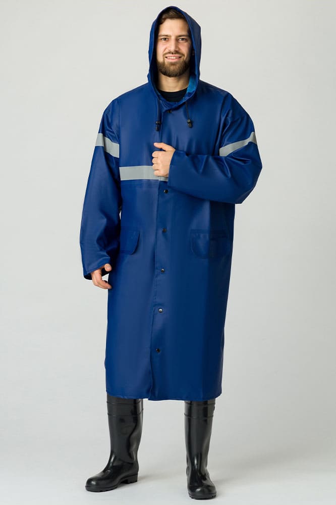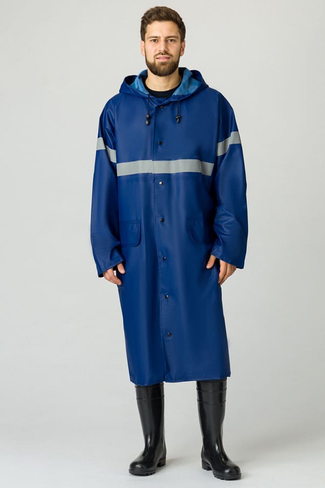 - конструкция плаща, материал, из которого он изготовлен, и сварные швы обеспечивают защиту от воды, ветра, сырой нефти и нефтепродуктов