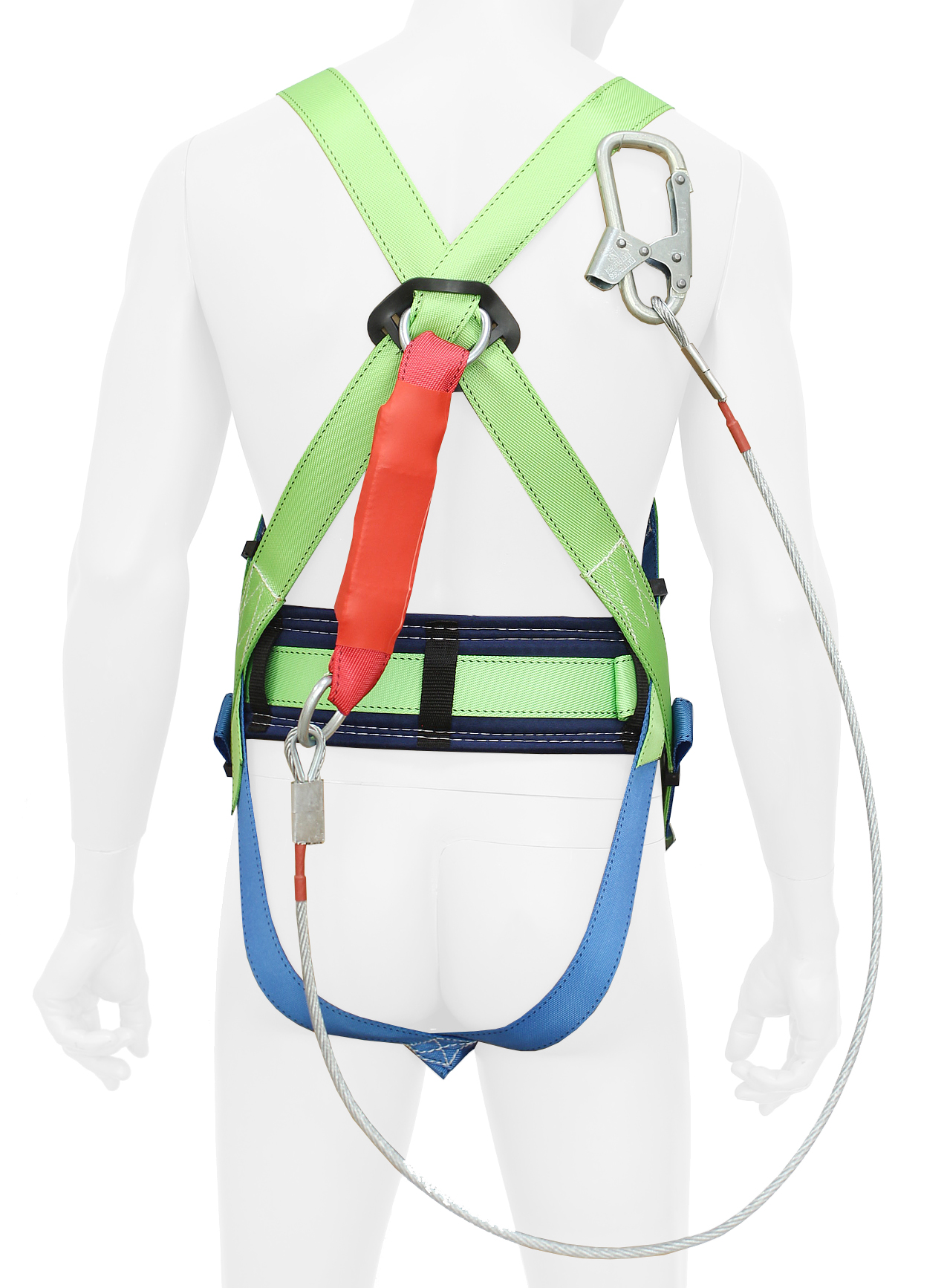 Страховочная система с наплечными и набедренными лямками со стропом из металлического троса в ПВХ оболочке с амортизатором.