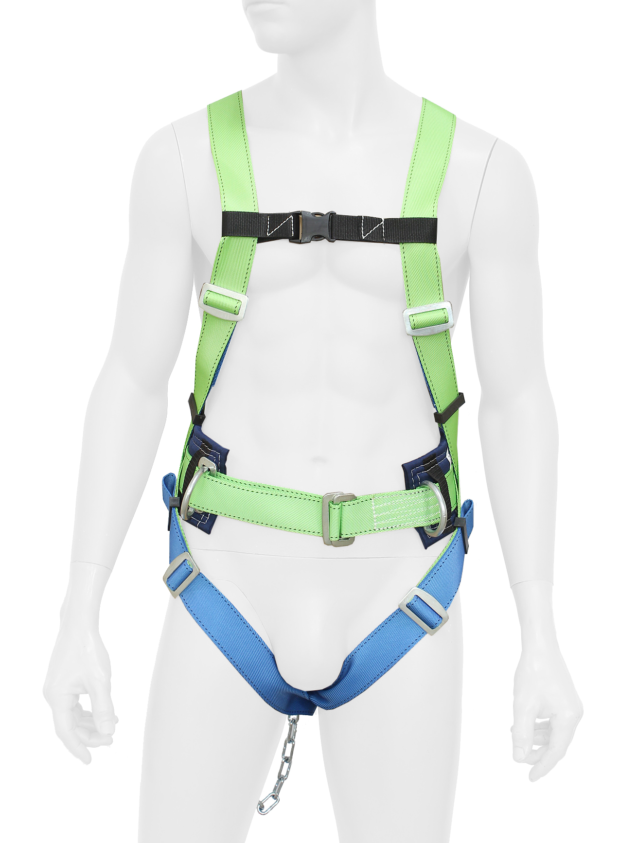 Состоит из привязи ремня с пряжкой, наплечных и набедренных лямок, кушака, двух D-колец на поясе (для удержания и позиционирования) и одного на спине и страховочного стропа из металлической цепи с амортизатором. Привязь упакована в водонепроницаемый пакет и содержит паспорт и инструкцию по применению.