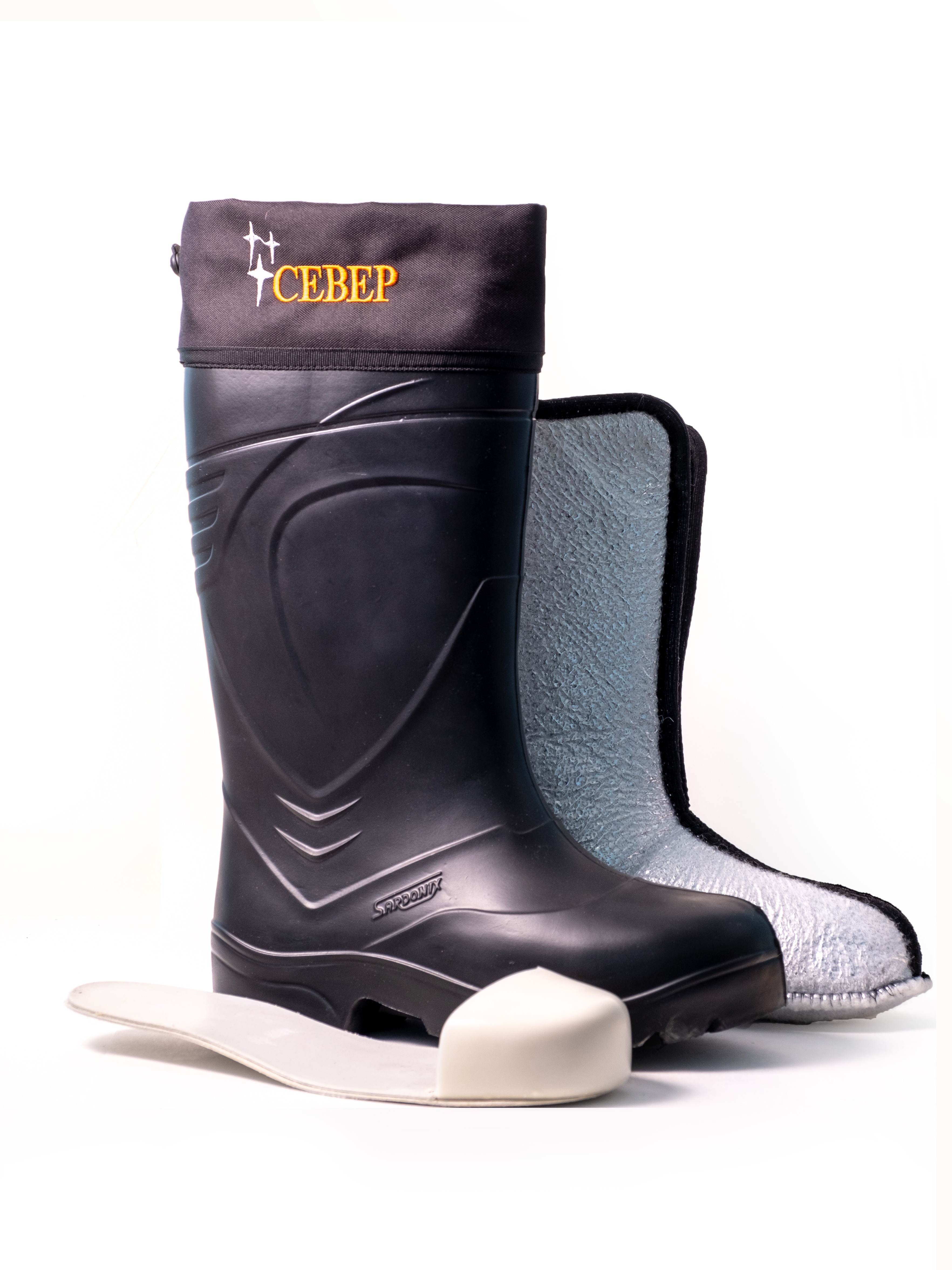 Сапоги мужские "Север" выполнены из современного материала ЭВА с комбинированной надставкой, с защитным полимерным подноском и стелькой, с двухслойным вкладным утеплителем из нетканного ворсового полотна с фольгированной прослойкой и искусственного меха с добавлением волокон натуральной шерсти. Обувь изготовлена методом однокомпонентного литья под давлением. Предназначена для применения в условиях агрессивных сред и пониженных температур, защиты ног от воды, Обладают легкостью (вес 1 пары 700 грамм). Предназначена для защиты от механических воздействий в носочной части до 200Дж, устойчива к проколу до 530Н. Обеспечивает противоскользящие свойства. Предназначена от общих производственных загрязнений, от кислот с концентрацией от 20 до 80%, от щелочей концентрацией от 20 до 50%, нефте-, масло-, жиростойкие.