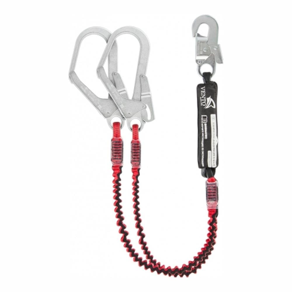 Строп имеет сложную структуру: эластичная лента обеспечивает уменьшение длины стропа при отсутствии нагрузки, внешняя трубчатая синтетическая лента принимает на себя основную нагрузку в момент остановки падения.