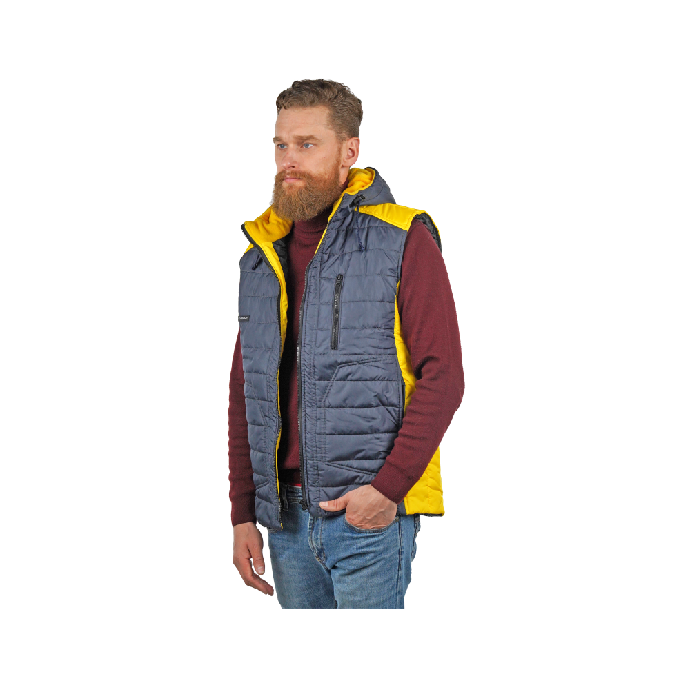 Жилет комбинированный из ткани двух цветов, утепленный, с центральной бортовой застёжкой на молнию, с верхним левым прорезным карманом на молнию, с нижними карманами в рельефе и втачным капюшоном. Изделие с накладным карманом на подкладке с правой стороны, застегивающимся на молнию. Спинка с фигурной линией низа.