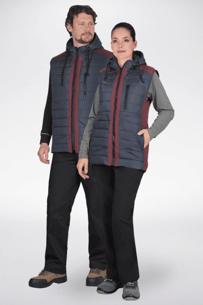 Жилет с капюшоном, комбинированный из двух цветов, центральные части переда и спинки простеганы вместе с утеплителем. Застежка жилета на молнию, спинка понизу фигурная удлиненная. Левый нагрудный прорезной карман на молнию, нижние карманы в швах. На подкладке с правой стороны накладной карман на молнию.