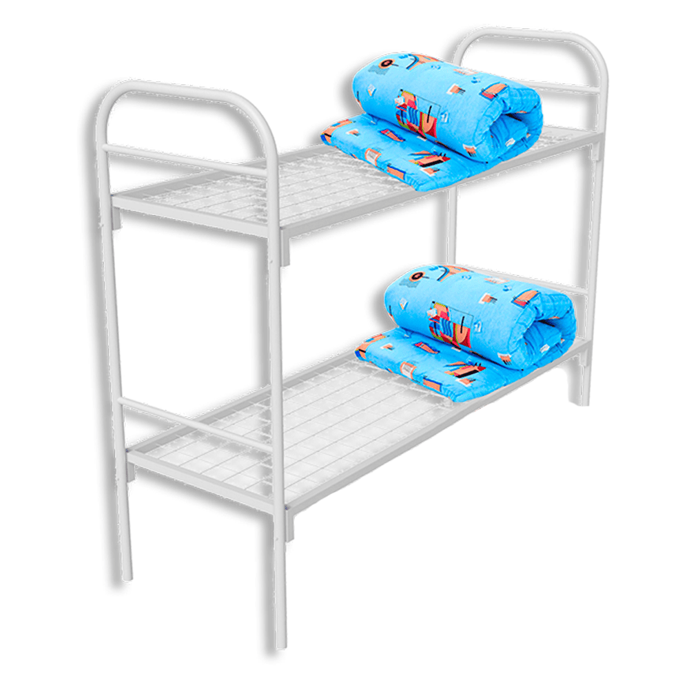 В комбо входит двухъярусная металлическая кровать на сварной сетке (800х1900 мм) и два ватных матраса (70х190 см). Данная продукция активно используется многими сферами общества: больница, строительные компании, армейские подразделения и другие.