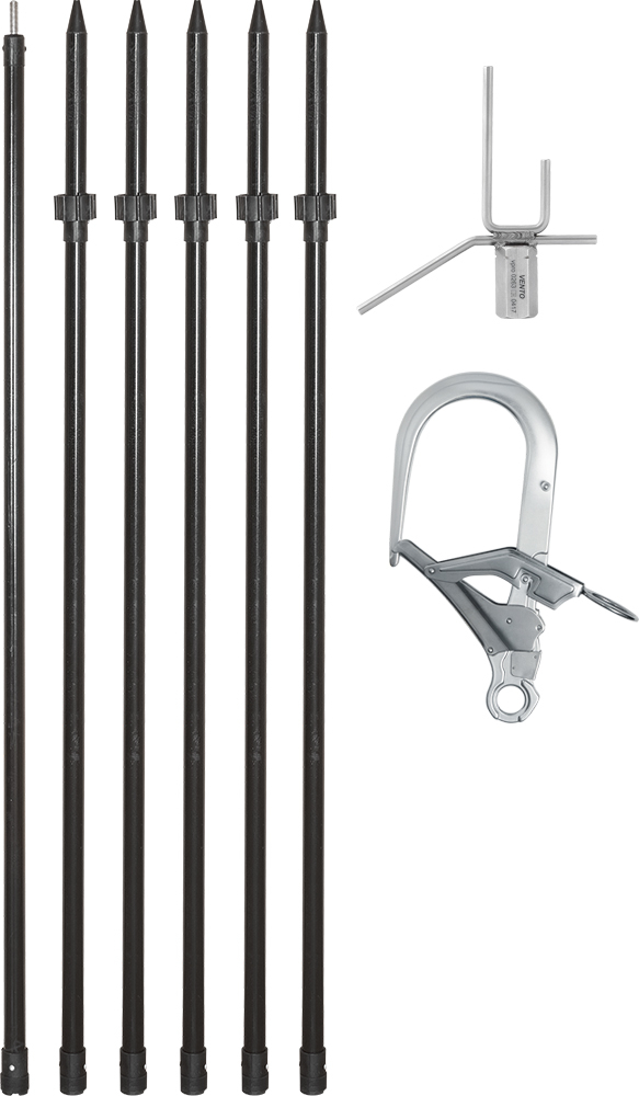 Комплект позволяет удерживать карабин в открытом состоянии для проведения работ по дистанционному присоединению устройств (на расстояние до 9 метров) к элементам конструкций, привязи пострадавшего и т.п.