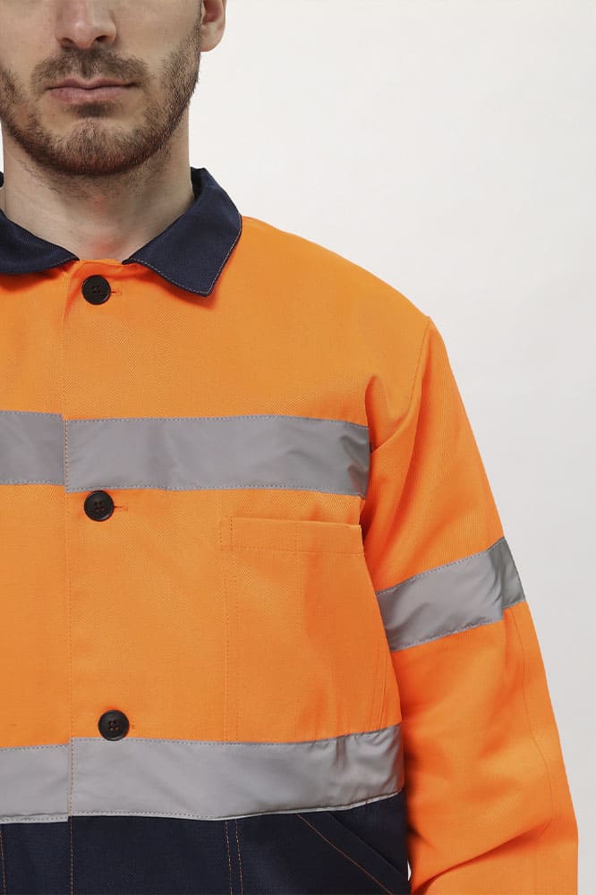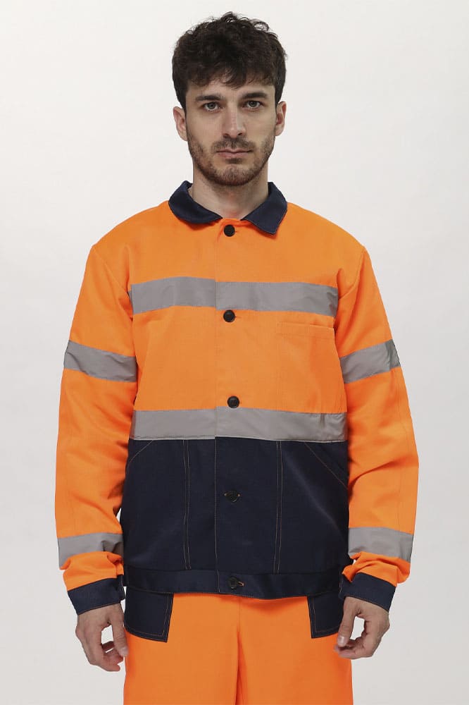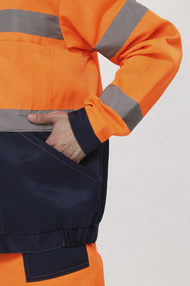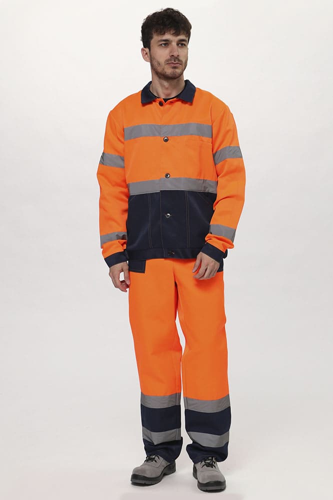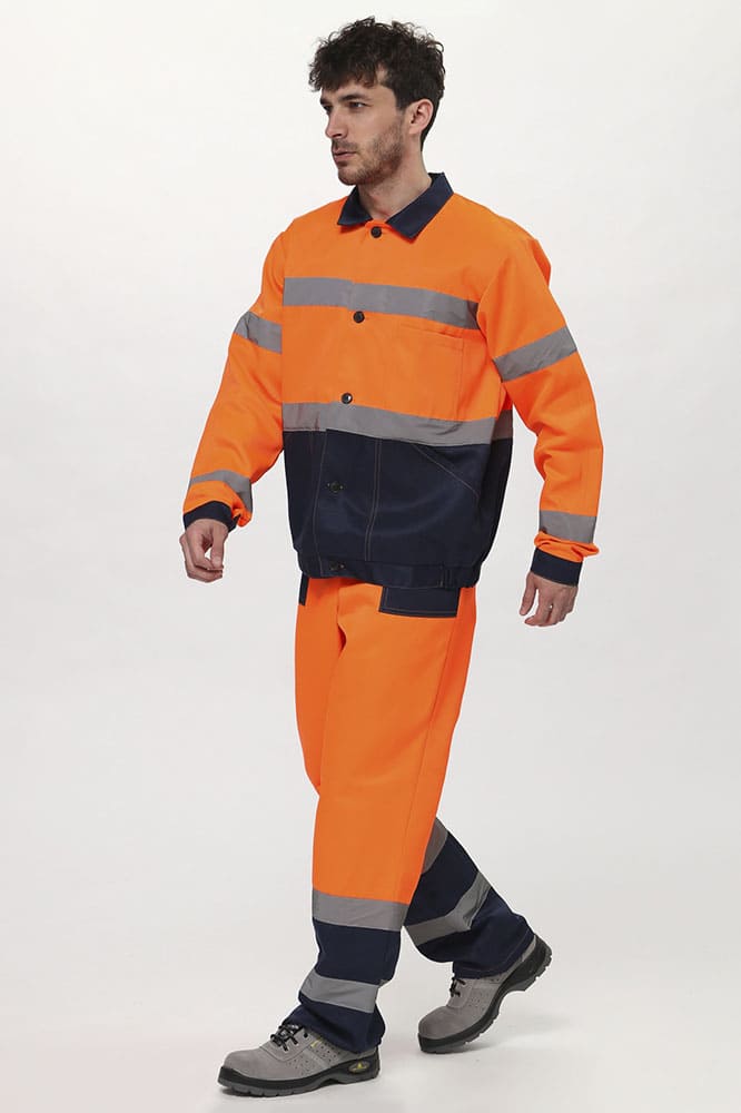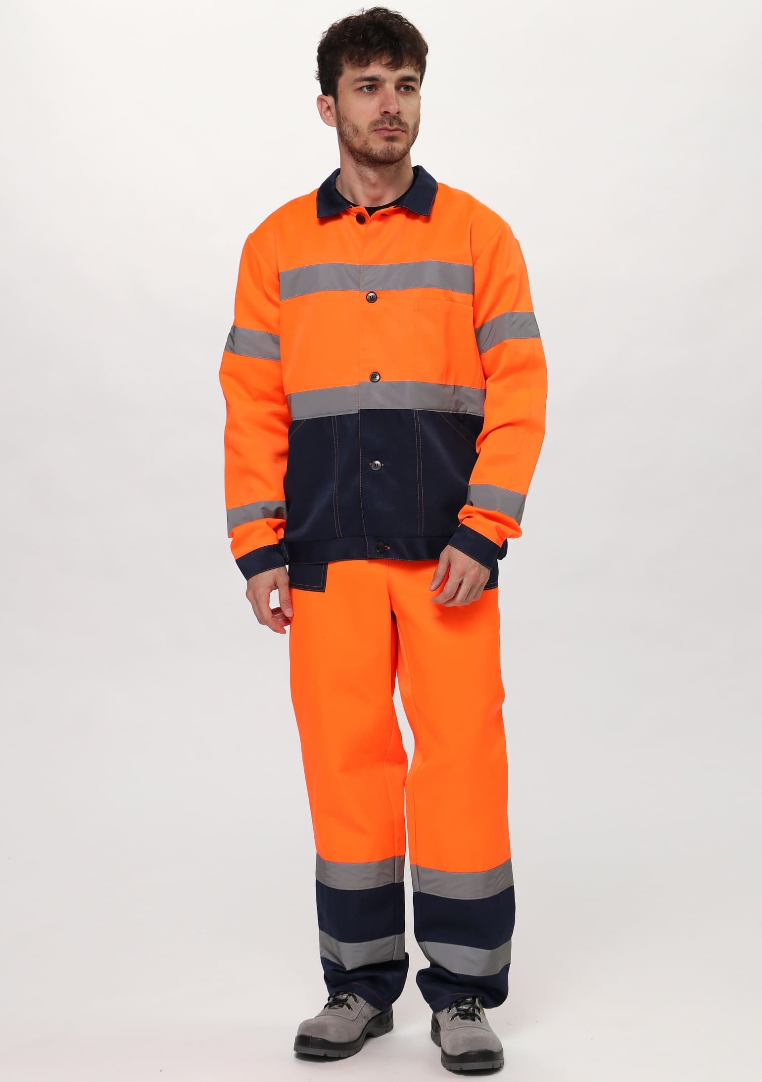Куртка прямого силуэта, с центральной застёжкой на 5 петель и пуговиц, с поясом. Полочки с удлиненными до линии талии кокетками, с накладным нагрудным карманом слева, разделенным на два отдела. Боковые накладные карманы с наклонной линией входа. Верхний срез кармана входит в шов стачивания верхней и нижней детали полочки, нижний в пояс, боковой срез кармана, входит в боковой шов куртки. Рукава втачные, одношовные, с налокотником, притачной манжетой, застегивающейся на одну петлю и пуговицу. Воротник втачной отложной. Полукомбинезон прямого силуэта с застежкой в переднем и боковом швах на петли и пуговицы(3 гольф, 2 боковой); с притачной грудкой по передней части. На грудке большой накладной карман с двумя зональными делениями, с клапаном. Передние половинки п/к с боковыми накладными карманами с наклонной линией входа. Задняя часть п/к с цельнокроеной спинкой, эластичной лентой на уровне талии. Бретели регулируются при помощи фастексов спереди и внутренней эластичной лентой сзади.
