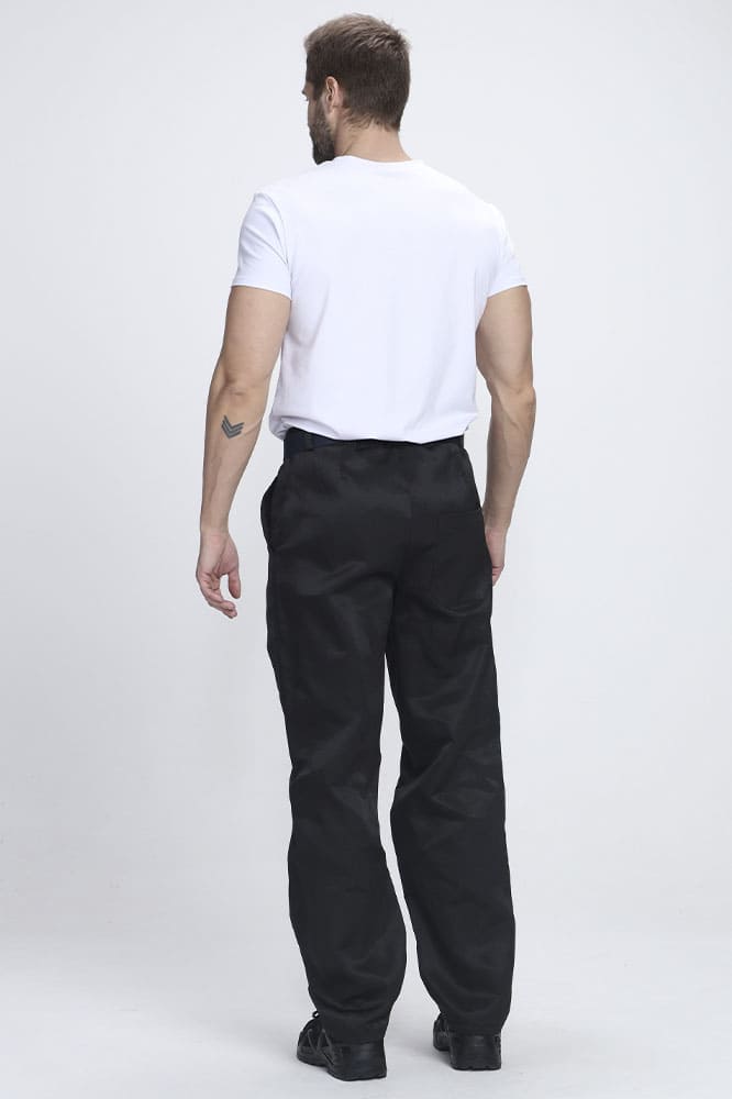 - прямого кроя, с застежкой гульфика на молнию. Передние половинки с боковыми карманами с отрезным бочком и с отстроченными стрелками вдоль брюк. Задние половинки с вытачками по линии талии. На правой задней половинке накладной карман.