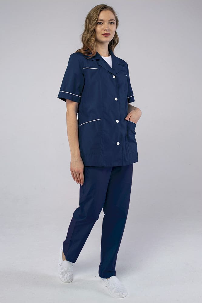- контрастным белым кантом отделаны кокетка, карманы и манжеты