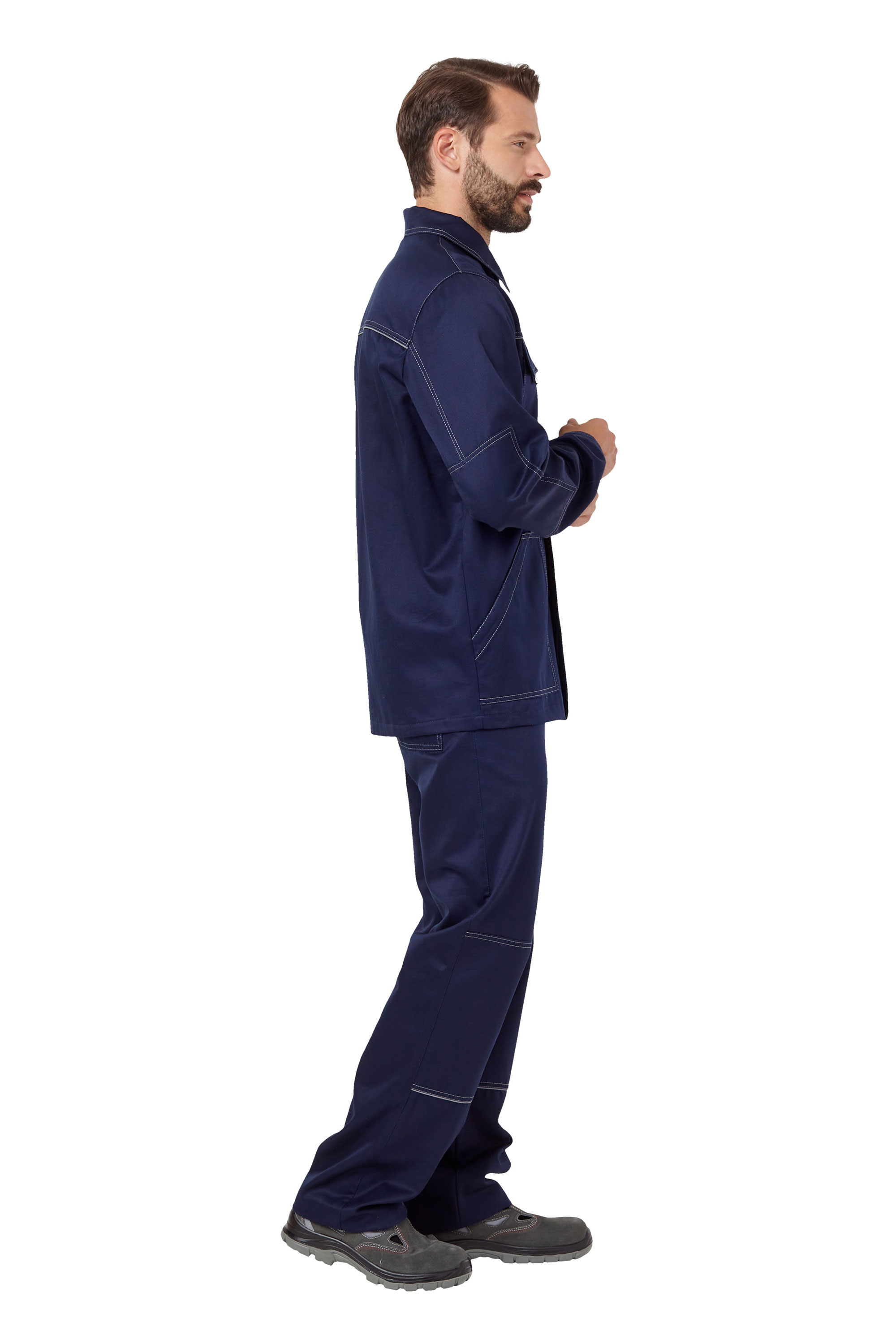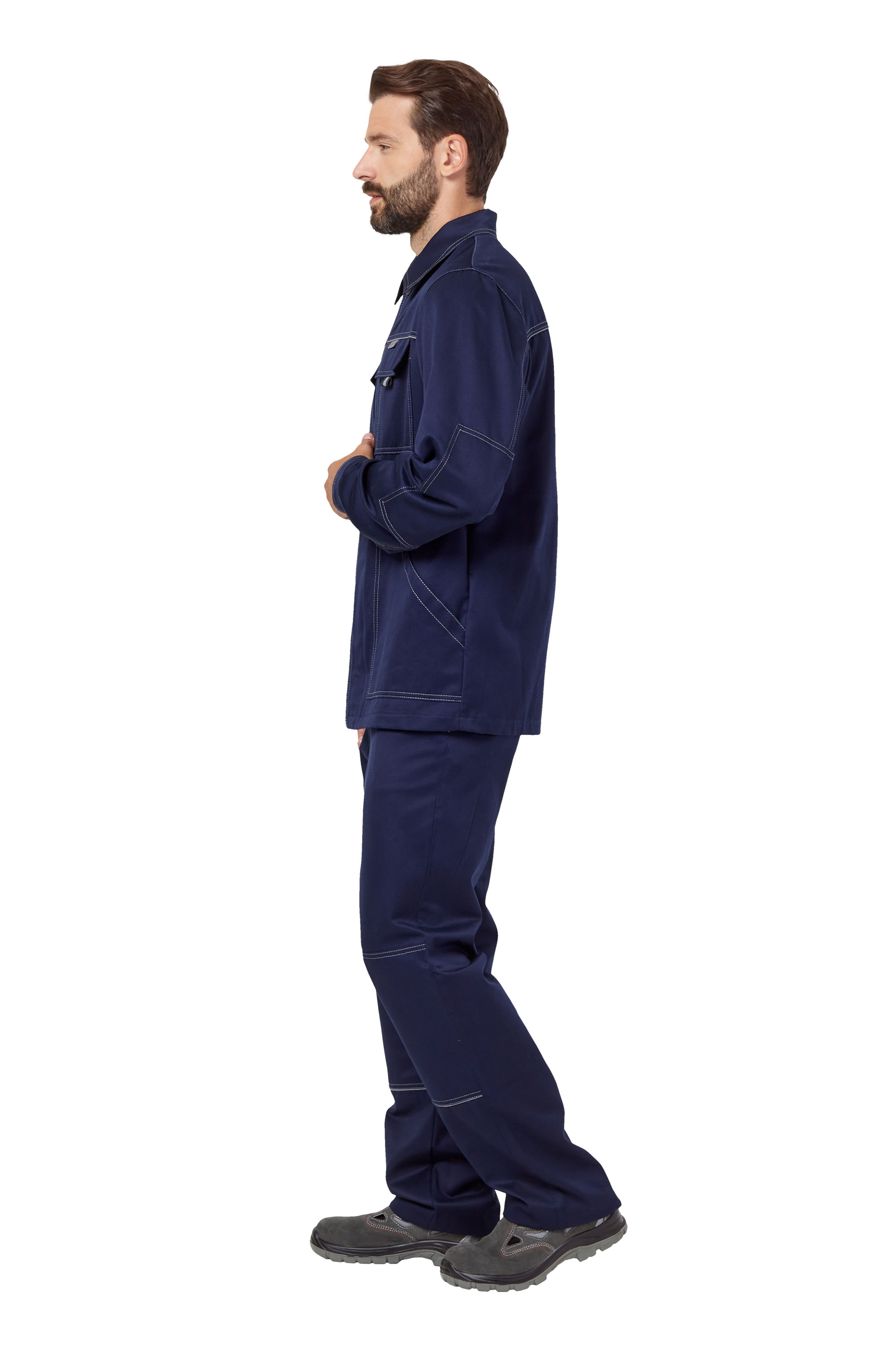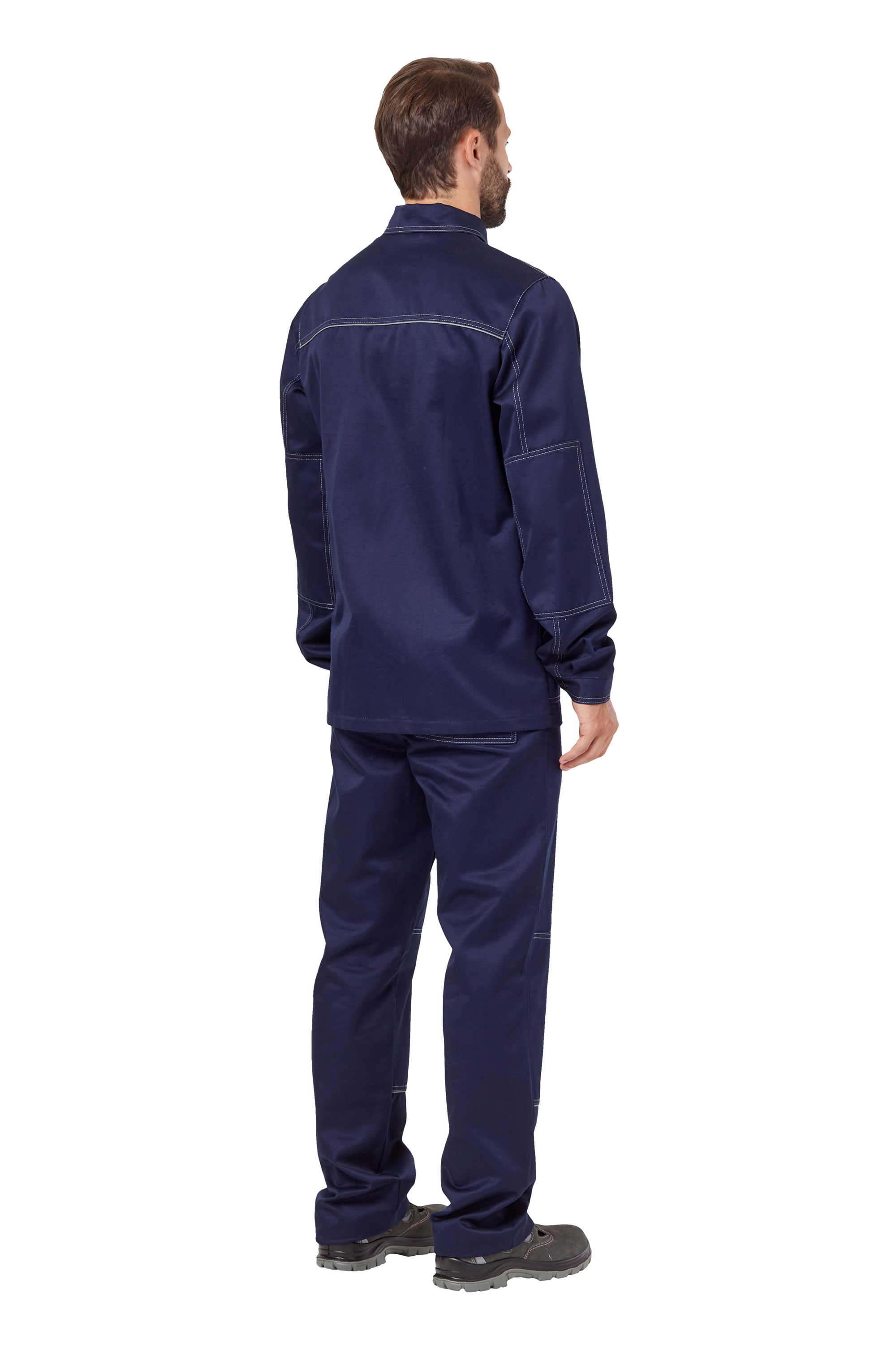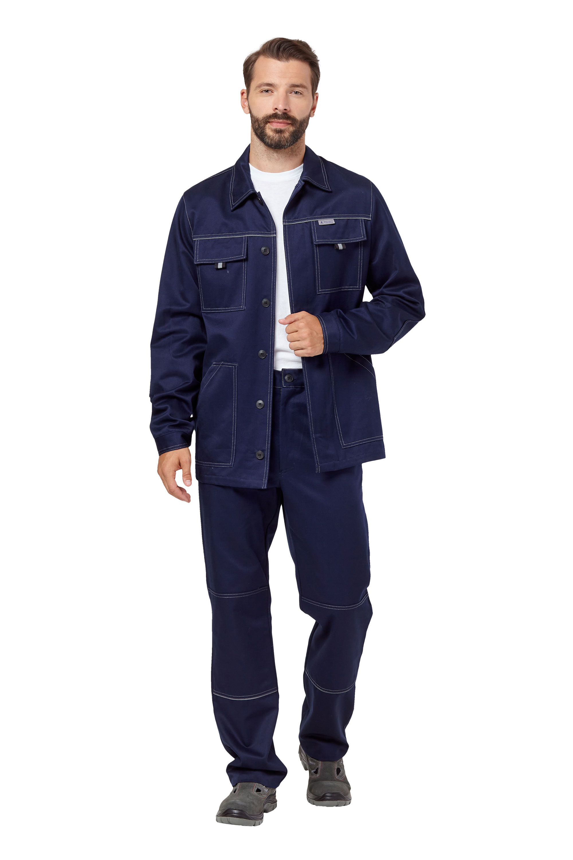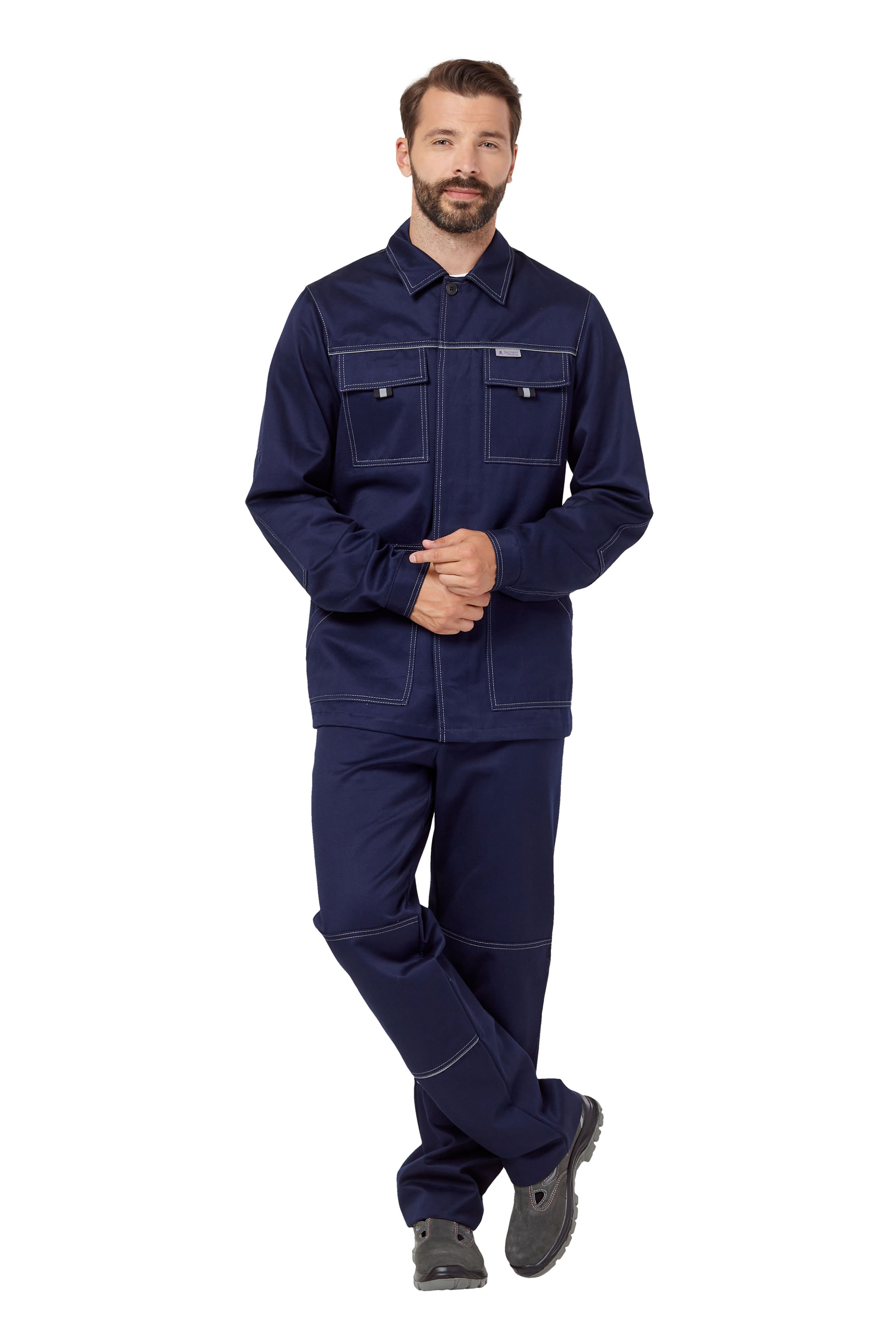 Удлиненная куртка прямого силуэта, с центральной потайной застежкой на пуговицы, с отложным воротником, рукава с налокотниками. В швах притачивания кокеток на спинке и полочках расположен светоотражающий кант шириной 3мм. Два прямых накладных нагрудных кармана с клапанами, застегивающимися на контактную ленту и два нижних накладных кармана с наклонным входом.