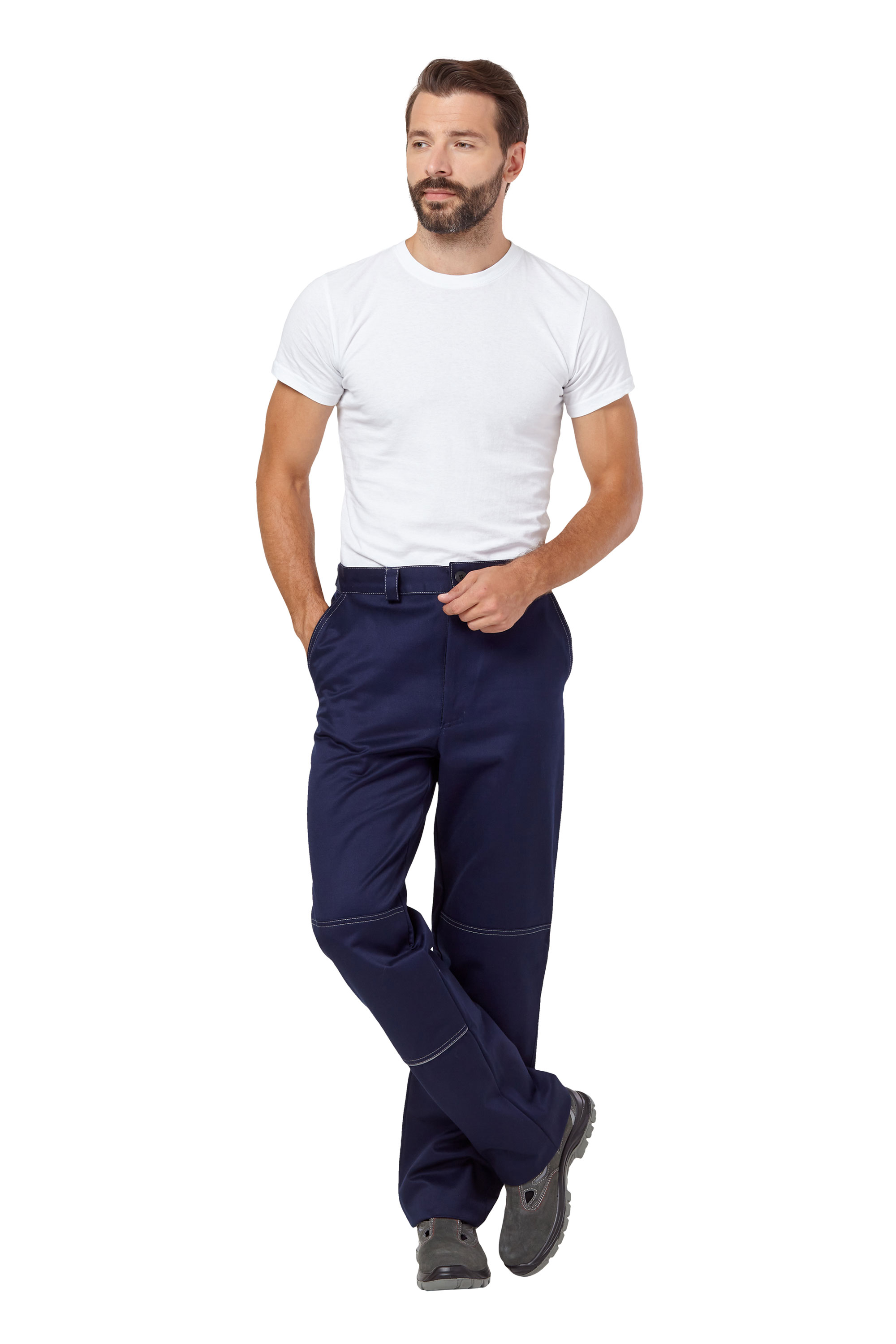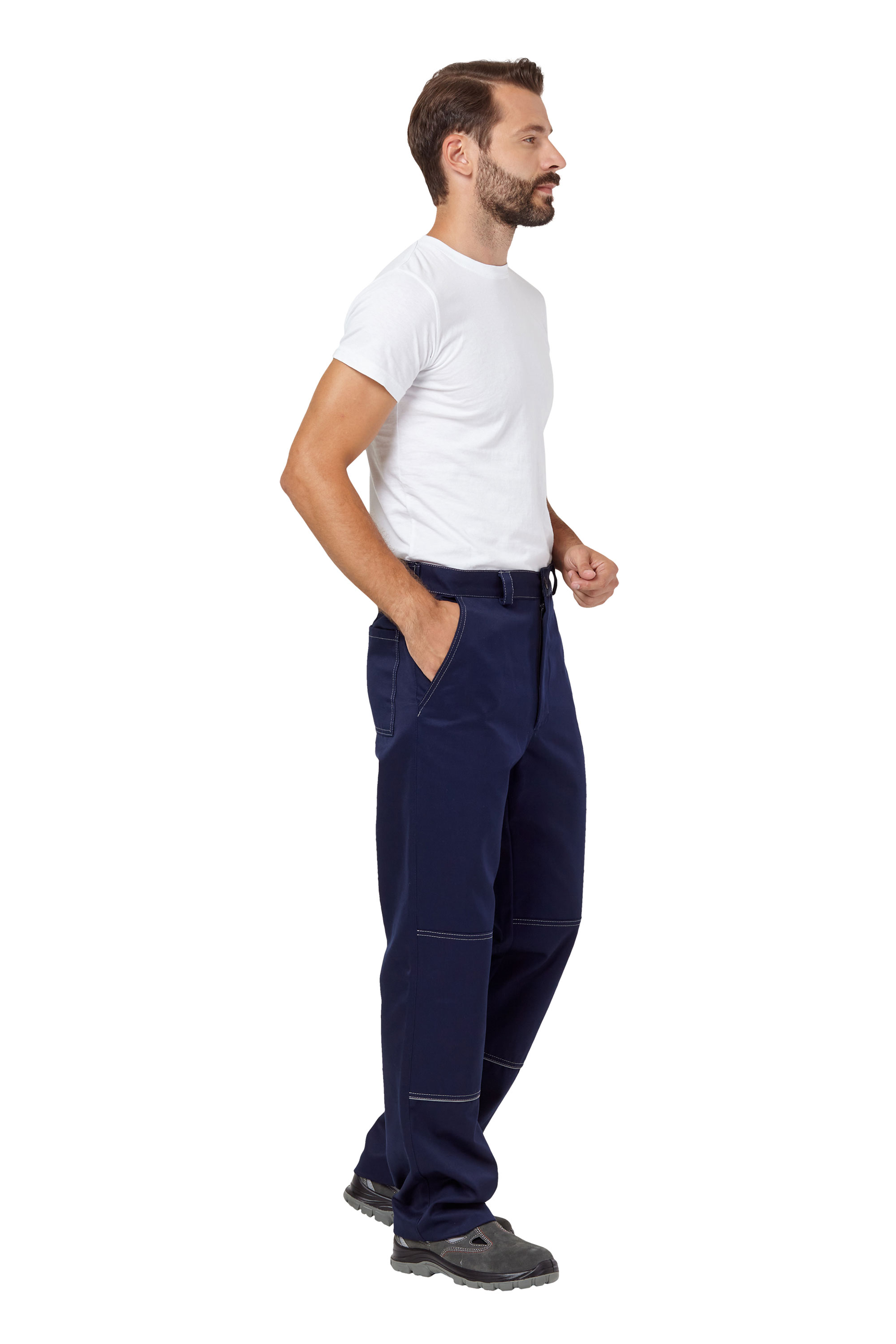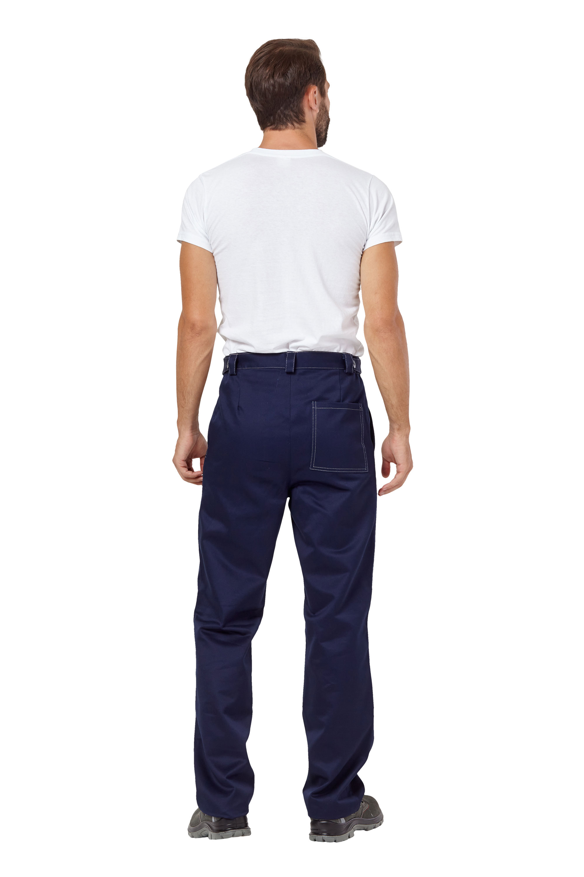 Брюки с притачным поясом со шлевками. Два боковых кармана с отрезным бочком, с усилительными накладками, в нижнюю часть которых втачан СВ кант шириной 3мм. Один задний накладной прямой карман.Застежка-гульфик на молнии.