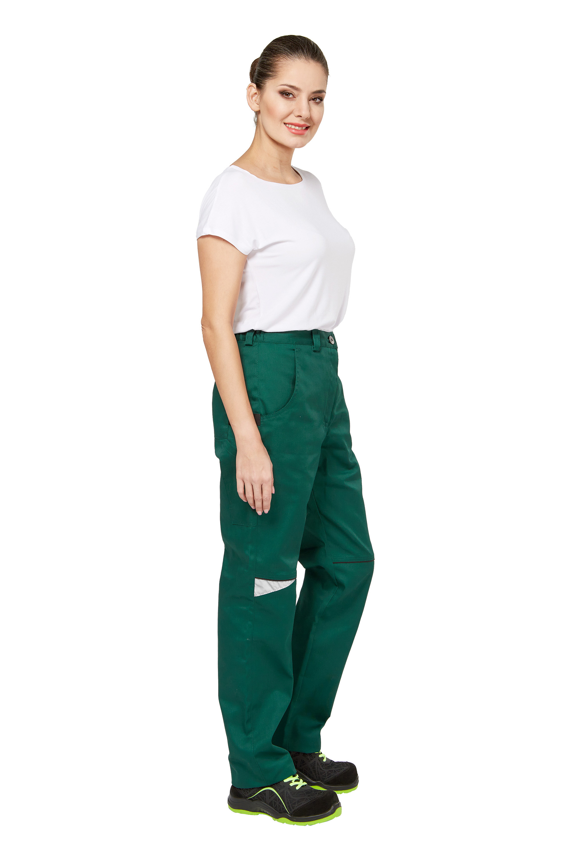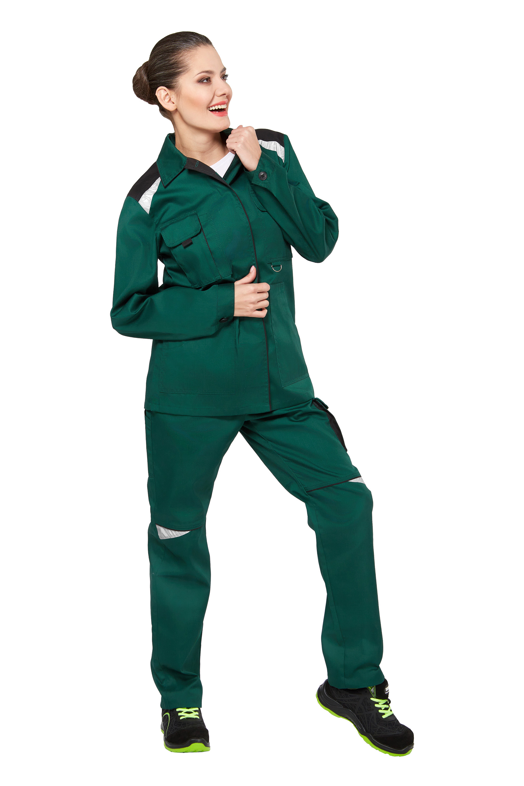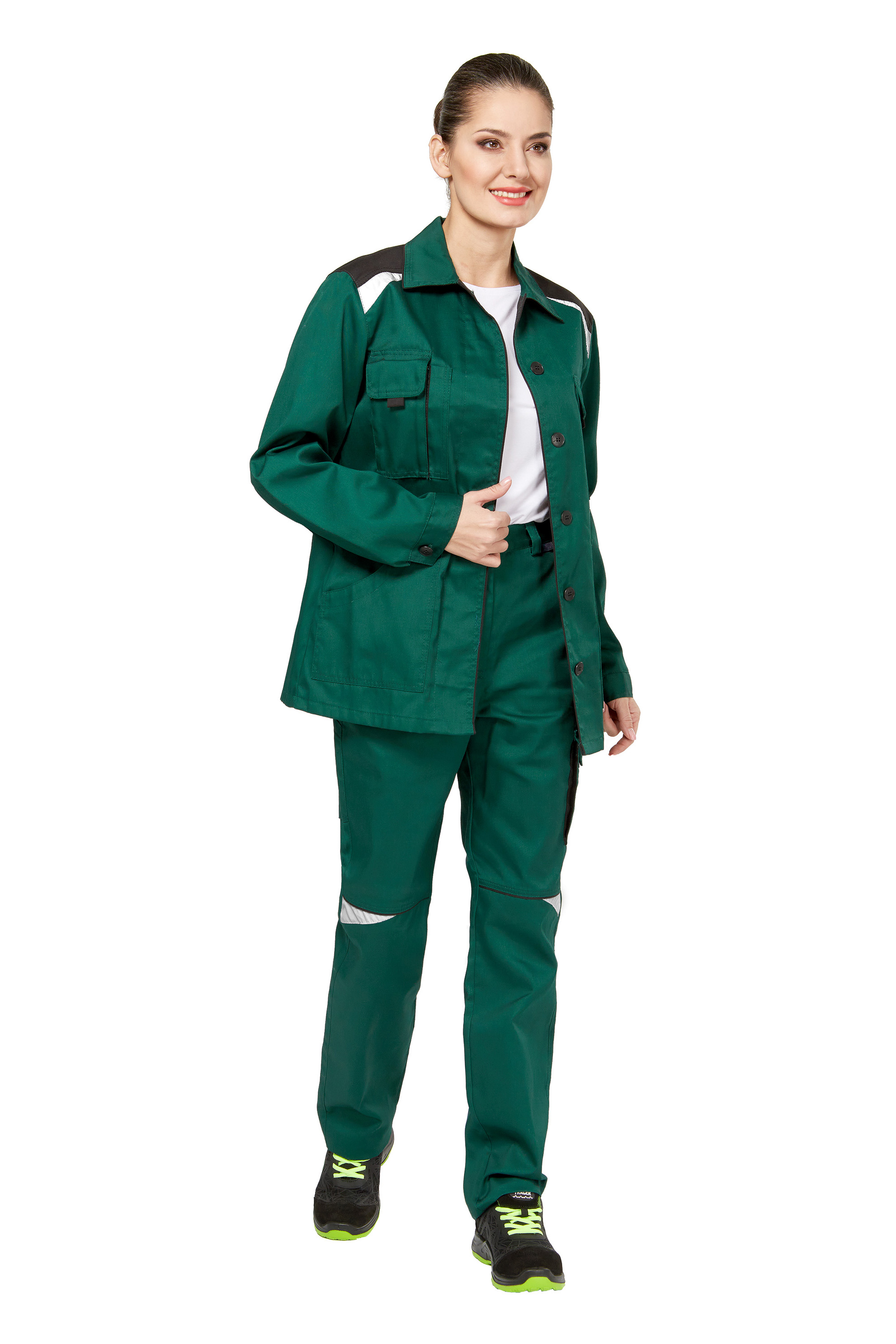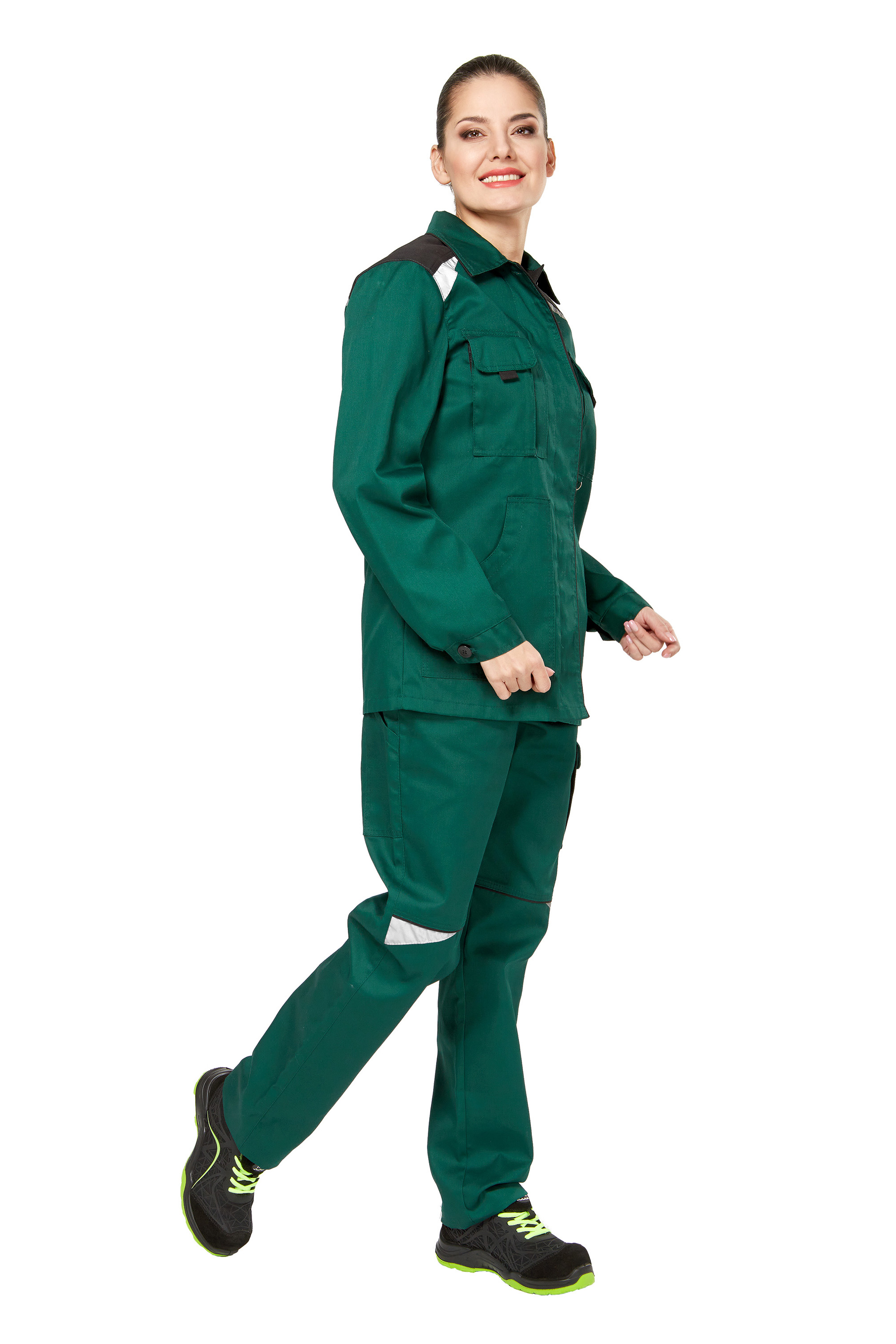 Костюм - куртка и брюки глубокого зеленого цвета из плотного 100% хлопка с фигурными светоотражающими элементами.