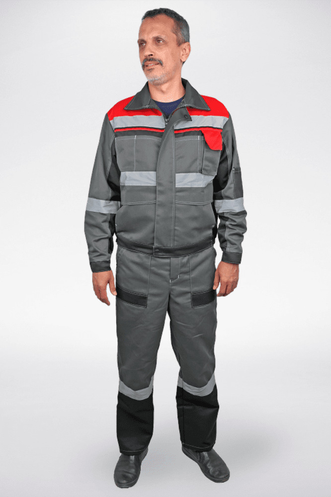 Костюм представлен укороченной курткой и полукомбинезоном. Световозвращающие полосы, расположенные по полочкам, спинке, брючинам, кокетке, рукавам, позволяют использовать данный вид специальной одежды в условиях плохой видимости. Полукомбинезон снабжен боковыми накладными карманами с усилениями, эластичной лентой по талии и в бретелях. У куртки - притачный пояс на резинке с супатной застежкой на молнию. Кроме того, у куртки множество функциональных карманов, один из которых для телефона с клапаном на липучке.