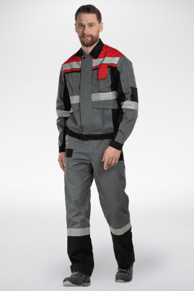 Костюм представлен укороченной курткой и полукомбинезоном. Световозвращающие полосы, расположенные по полочкам, спинке, брючинам, кокетке, рукавам, позволяют использовать данный вид специальной одежды в условиях плохой видимости. Полукомбинезон снабжен боковыми накладными карманами с усилениями, эластичной лентой по талии и в бретелях. У куртки - притачный пояс на резинке с супатной застежкой на молнию. Кроме того, у куртки множество функциональных карманов, один из которых для телефона с клапаном на липучке. Пропитка: ВО. ГОСТ: 27575-87.