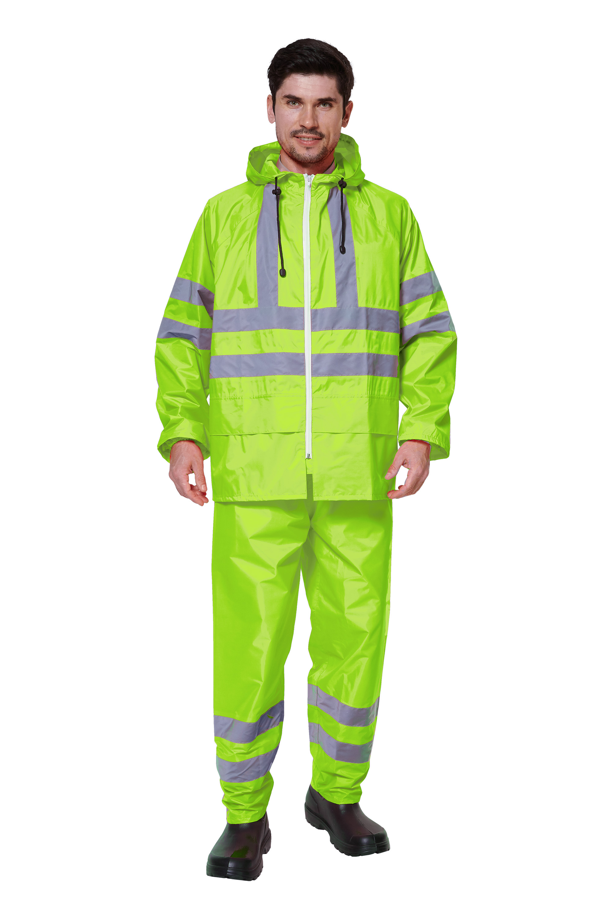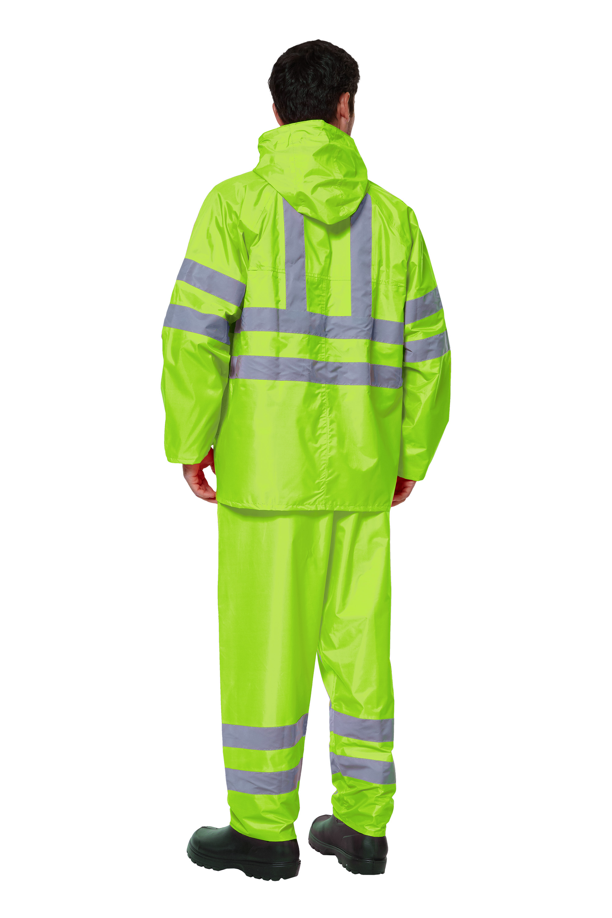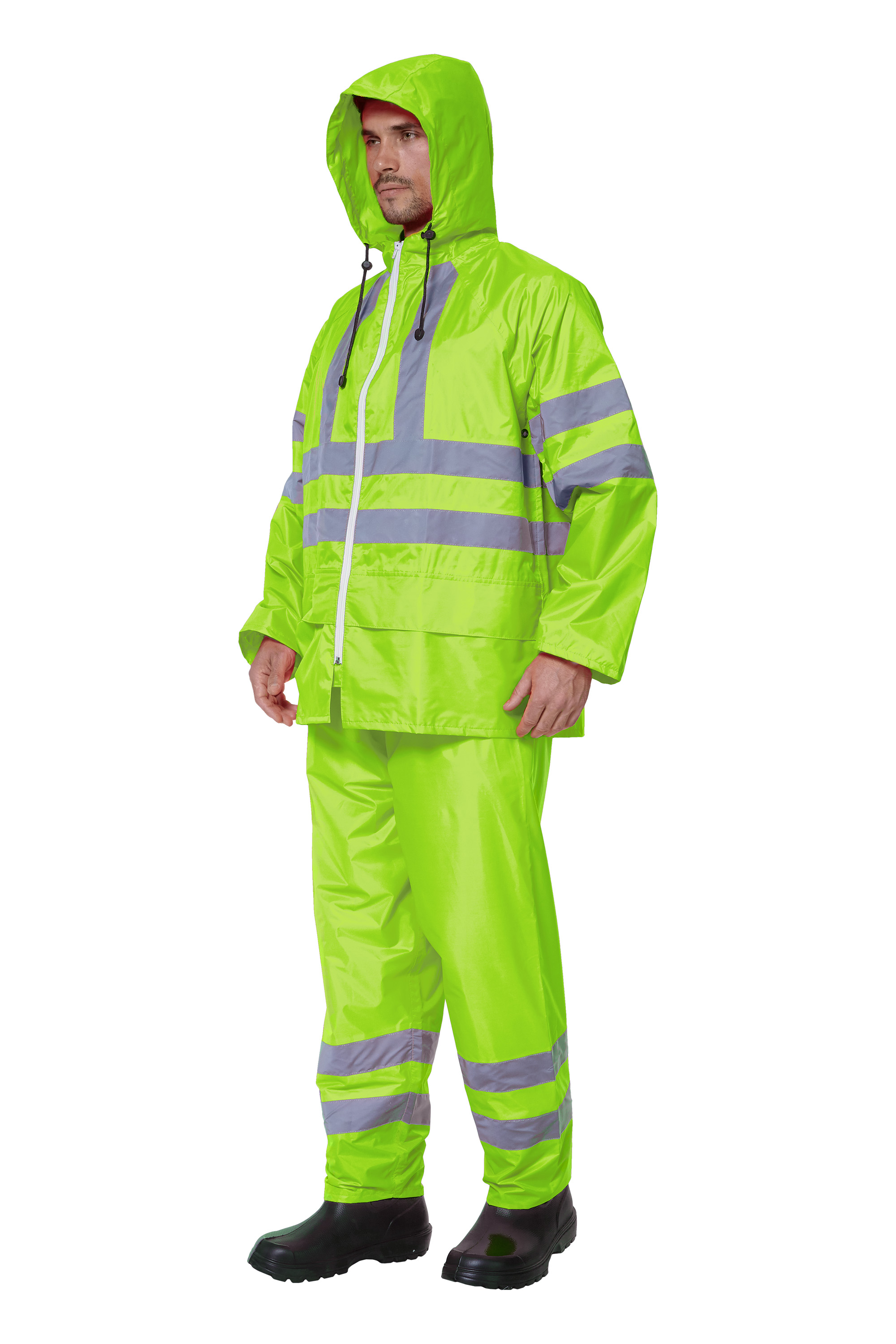 Костюм состоит из куртки и брюк. Куртка с капюшоном, центральной застежкой на "молнию" и внутренней ветрозащитной планкой, двумя накладными карманами с клапанами, с манжетами на рукавах из эластичной тесьмы. Для обеспечения повышенной видимости, куртка имеет четыре светоотражающие полосы (СОП, класс 3) шириной 50мм. Две СОП проложены горизонтально вокруг торса и две СОП проложены вертикально от плеча до уровня горизонтальных СОП. Для создания воздухообмена во время работы, в куртке имеются вентиляционные отверстия на уровне подмышечных впадин. Объем капюшона и нижняя часть куртки регулируется при помощи специального шнура. Брюки прямого свободного покроя с поясом из эластичной тесьмы и шнурка-фиксатора. Брюки имеют по две СОП ниже колен штанины. Изделие выполнено из синтетического водоупорного материала: 100% полиэфир с внутренним ПВХ покрытием. Все швы изделия проклеены изнутри и герметичны. Ткань экологична и соответствует европейскому стандарту по содержанию вредных веществ EN 71 PART3. Рекомендуется для рыболовецких хозяйств, портовых рабочих, строителей, дорожных и муниципальных служб.