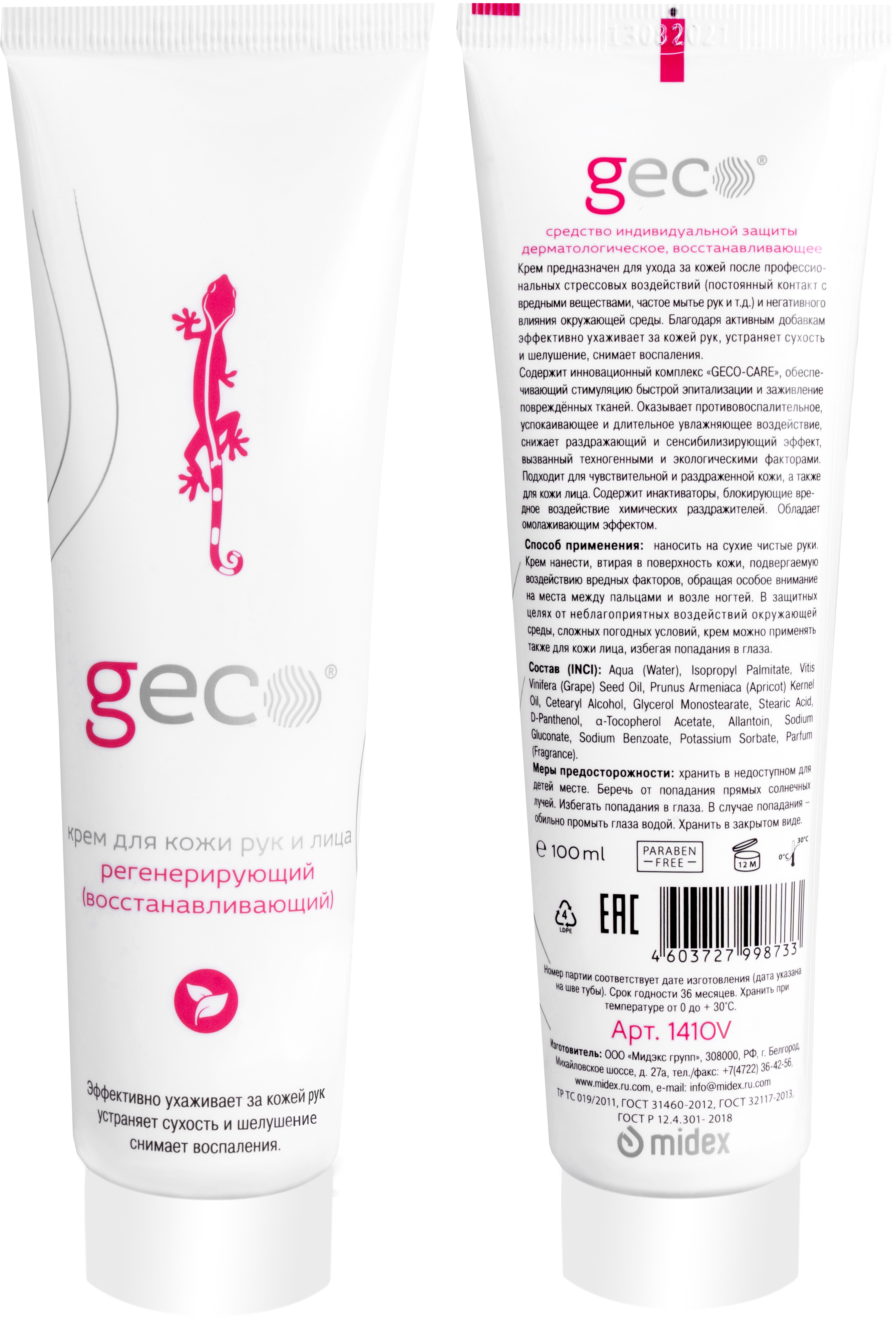 Содержит инновационный комплекс “GECO-CARE”. Его основные компоненты, d-пантенол и α-токоферол ацетат, усиливают действие друг друга. Они подобраны в специальном соотношении, что приводит к уникальному синергетическому эффекту, который обуславливает высокую эффективность средств и обеспечивает стимуляцию быстрой эпитализации и заживления повреждённых тканей. Комплекс “GECO-CARE” оказывает противовоспалительное, успокаивающее и длительное увлажняющее воздействие, снижает раздражающий и сенсибилизирующий эффект, вызванный техногенными и экологическими факторами. Крем легко наносится на кожу и быстро впитывается, не создает неудобства при работе, после работы легко смывается. Не вызывает коррозии на металлических деталях, не портит изделия и материалы. Подходит для чувствительной и раздраженной кожи, а также для кожи лица.