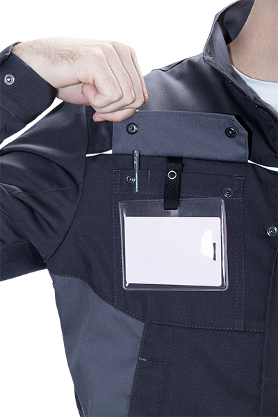 • в правом нагрудном кармане под клапаном петля на кнопке для крепления бейджа